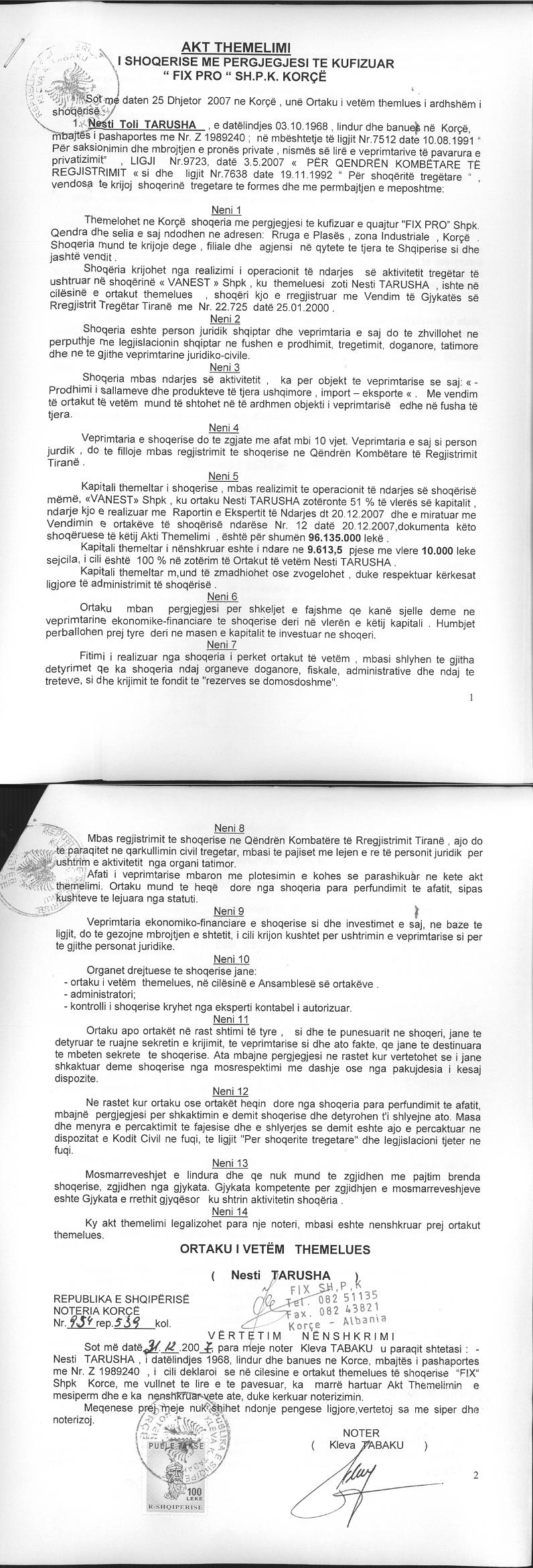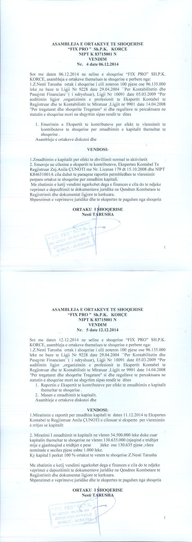 → Ekstrakt Historik i Regjistrit Tregtar date 09.10.2023 → Akt themelimi i Shoqerise → Vendim i Asamblesë së Ortakëve, Zmadhim Kapitali datë 06.12.2014 → Ekstrakt Historik i Regjistrit Tregtar date 17.04.2024 → Të dhënat e Investimit, Financimet Nga IPARD - Aksesuar nga Agjencia për Zhvillim Bujqësor dhe Rural AZHBR datë 17.04.2024 |