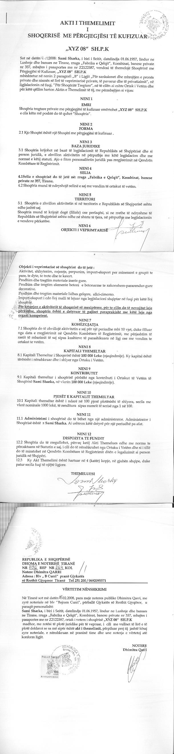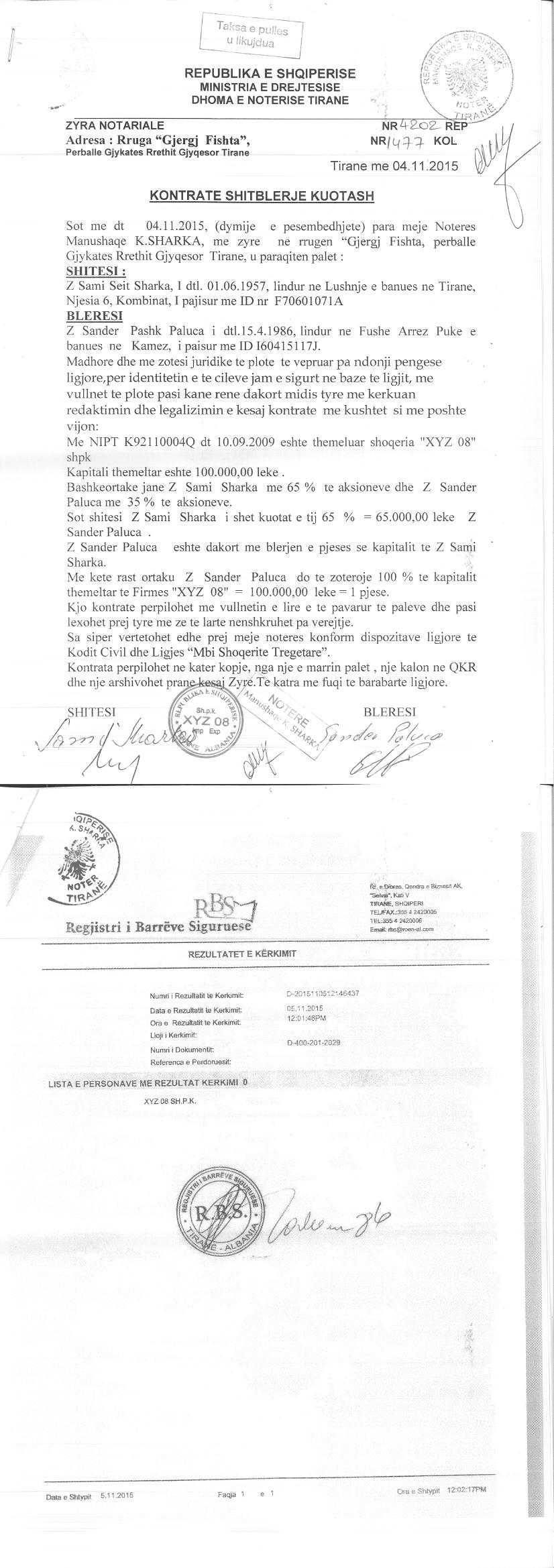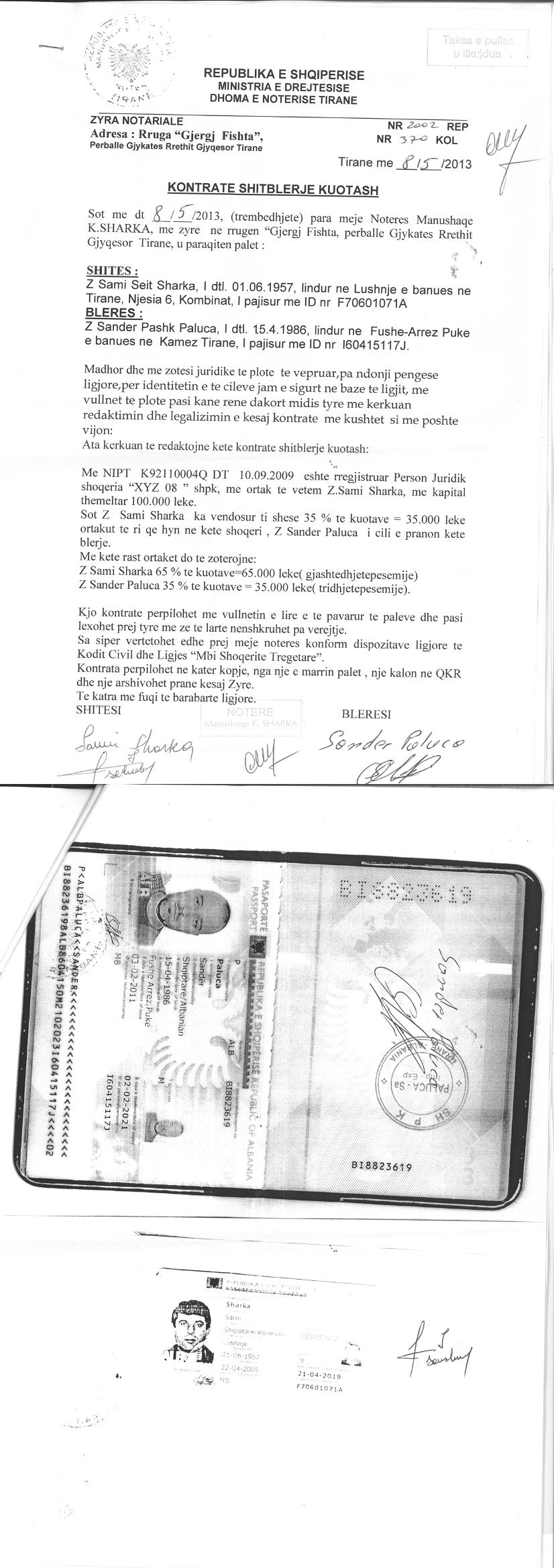 → Ekstrakt Historik i Regjistrit Tregtar date 24.07.2023 → Akt themelimi i Shoqerise → Ekstrakt Historik i Regjistrit te Pronarve Perfitues date 29.10.2022 → Kontrate Shitblerje Kuotash date 08.05.2013 → Kontrate Shitblerje Kuotash date 04.11.2015 → Kontrate Shitje Kuotash date 13.11.2015 → Urdher per Venie Sekuestro date 12.06.2018 → Urdher per Heqje Sekuestro date 26.06.2018 → Urdher per Venie Sekuestro date 15.05.2019 → Urdher per Heqje Sekuestro date 24.05.2019 → Urdher per Ekzekutimin e Vendimit Penal date 27.07.2022 te Gjykatës së Posaçme e Shkallës së Parë për Korrupsionin dhe Krimin e Organizuar → Kërkesa Nr. 2358 Prot., datë 09.08.2022, ardhur nga Agjencia e Administrimit të Pasurive të Sekuestruara dhe Konfiskuara |