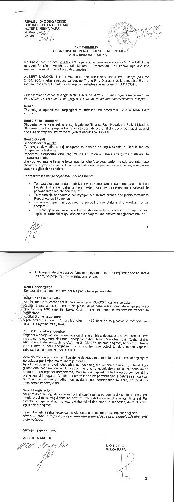 | Shoqëri e Kontrolluar nga ky Subjekt: | “Auto Manoku Servis”, shoqëri me përgjegjësi të kufizuar, e themeluar më 04/11/2016, sipas ligjeve të Republikës së Shqipërisë, me numër identifikimi në regjistrin tregtar NIPT L62311016C, me adresë aktuale në Tirane Kashar, Yrshek, Rruga Nozllaku, Godine 2 kateshe, Kati 1, Zona Kadastrale 3866,Nr. Pasurie 287/28., dhe me administrator Albert Manoku. “AUTO MANOKU” zotëron 100% të kapitalit të shoqërisë. (Sipas të dhënave të QKB deri më datë 07.02.2024) |