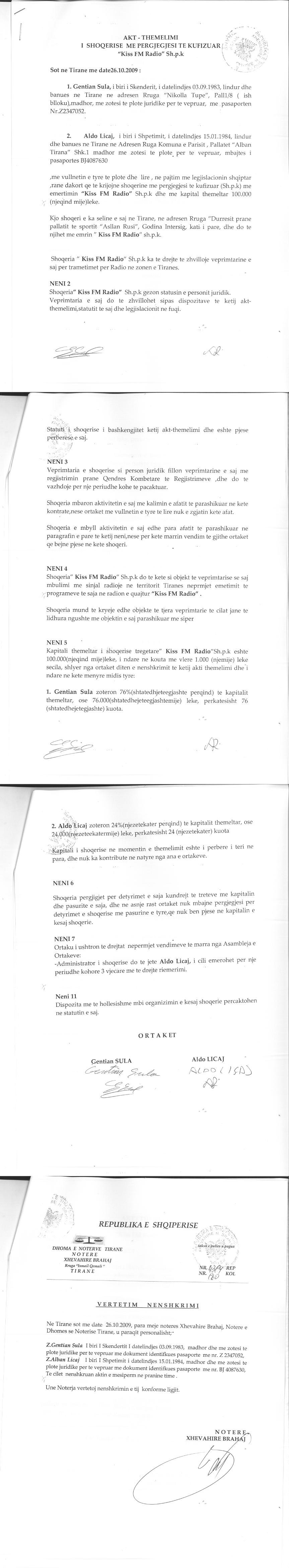 perfaqesues ligjor Anesti Nasi. Dokumentacioni do të qëndrojë i bllokuar deri në një urdher te dyte. Kreditor: Autoriteti i Mediave Audiovizive; Objekti: Gjobe. II. Me date 06.01.2014, ne baze te Urdhrit Nr. 905-556, Prot., lëshuar nga Shoqëria "Prestige Bailiff Services" sh.p.k., u urdhera:"Heqja e masës së sekuestros konservative mbi aksionet/kuotat e debitorit e Radio One me Nipt K92226026O me perfaqesues ligjor Anesti Nasi. Kreditori: Autoriteti i Mediave Audiovizive; Objekti: Gjobe. III. Me date 11.08.2021, ne baze te shkresës, Nr.9187– Prot., i Drejtorise se Pergjithshme te Tatimeve, Drejtoria e Mbledhjes se Detyrimeve Tatimore te Papaguara, Rajoni Qendror, u vendos masa e sigurimit tatimor mbi pasuritë e tatimpaguesit Kiss FM SHPK, me NIPT K92226026O, duke moslejuar tjetërsimin mbi pasurinë dhe të drejtat e tjera pasurore që i përkasin këtij subjekti, deri ne shlyerjen e plote te detyrimeve tatimore. |