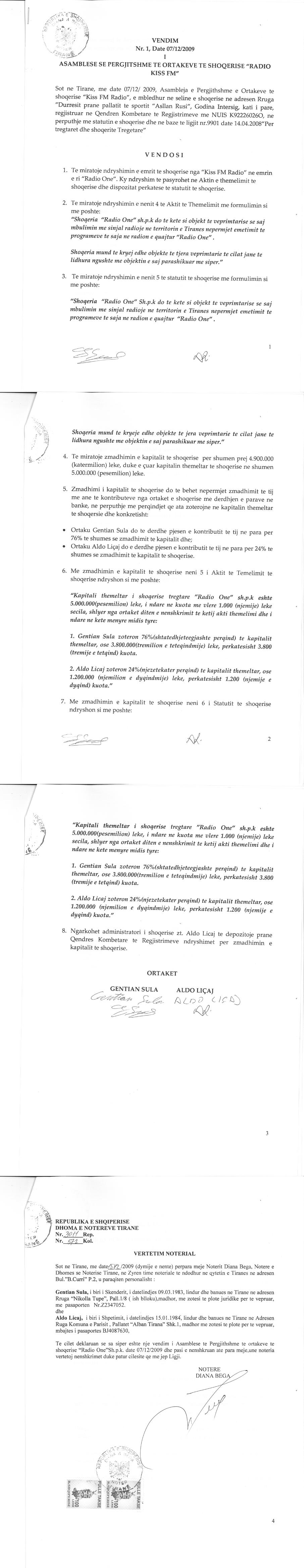 | Objekti i Veprimtarisë: | Mbullimi me sinjal radioje ne territorin e Tiranes nepermjet emetimit te programeve te saj ne radion e quajtur Radio One. |