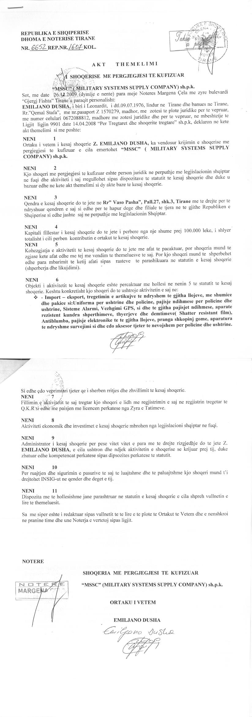 | Shoqëri e Kontrolluar nga ky Subjekt: | “M.K.D”, nje shoqeri aksionere, e themeluar me date 01/08/2025 sipas ligjeve te Republikes se Shqiperise, me numer identifikimi biznesi NIPT M52008029J, me adrese aktuale në Tirane Rruga Dervish Hima, 3 Kullat, Kulla Nr.1 Kati 1, Zona Kadastrale 8160, Tirane. Administrator i shoqerise eshte Gentian Karaj. Ortaket e shoqerise jane “MSSC” 80% dhe “KAYO” 20%. (Sipas të dhënave të QKB deri më datë 18.08.2025) “GUNA TACTICAL”, nje shoqeri aksionere, e themeluar me date 01/08/2025 sipas ligjeve te Republikes se Shqiperise, me numer identifikimi biznesi NIPT M52008021O, me adrese aktuale në Tirane Rruga e Dibrës, Garnizioni Skenderbej, Tirane. Administrator i shoqerise eshte Leonard Qyra. Ortaket e shoqerise jane “MSSC” 49% dhe “KAYO” 51%. (Sipas të dhënave të QKB deri më datë 18.08.2025) |