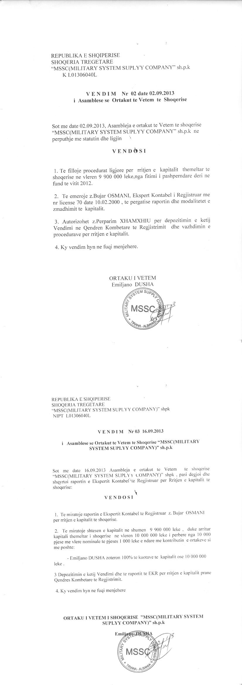 → Ekstrakti Historik i Regjistrit Tregtar date 19.01.2023 → Akt themelimi i Shoqerise → Vendim i Ortakut te Vetem, Zmadhim Kapitali date 16.09.2013 → Vendim i Ortakut te Vetem, Zmadhim Kapitali date 14.07.2016 → Vendim i Ortakut te Vetem, Zmadhim Kapitali date 30.08.2017 → Vendim i Ortakut te Vetem, Zmadhim Kapitali date 30.08.2019 → Ekstrakt Historik i Regjistrit Tregtar date 15.05.2023 → Ekstrakt Historik i Regjistrit Tregtar date 03.12.2024 → Vendim i Ortakut të Vetëm për Zmadhimin e Kapitalit datë 08.05.2024 → Ekstrakt Historik i Regjistrit Tregtar date 18.08.2025 |