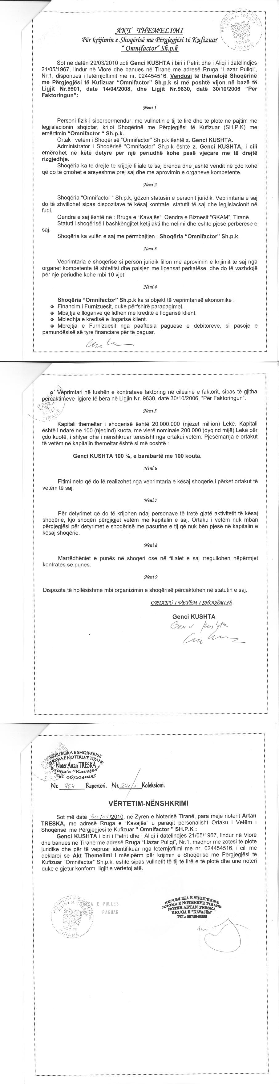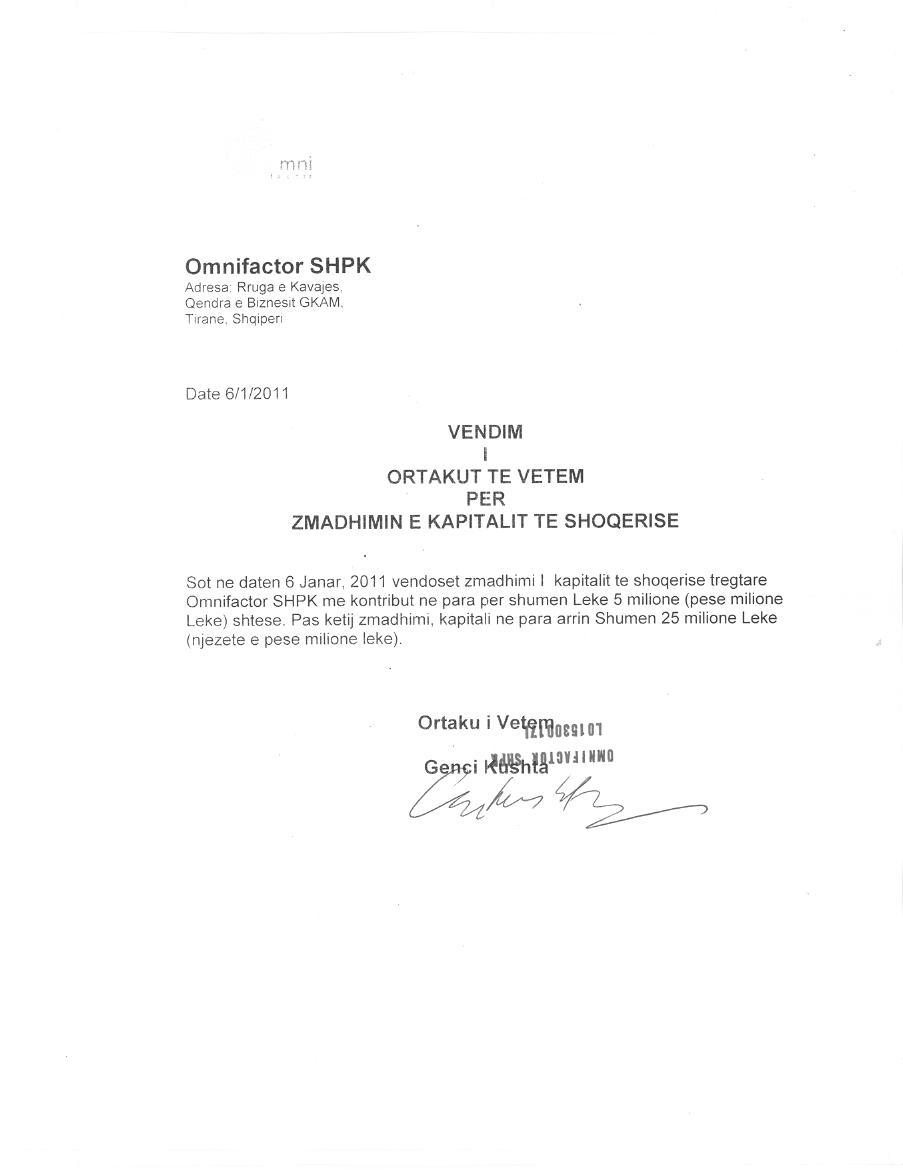 → Ekstrakt Historik i Regjistrit Tregtar date 30.05.2023 → Akt themelimi i Shoqerise → Kontratë Shitje Kuotash datë 23.03.2015 → Vendim i Asamblesë së Përgjithshme të Ortakëve, Shitje e Kuotave të Kapitalit datë 14.04.2016 → Vendim i Ortakut të Vetëm, Zmadhim Kapitali datë 06.01.2011 → Vendim i Asamblesë së Përgjithshme, Zmadhim Kapitali datë 14.12.2021 → Ekstrakt historik i regjistrit tregtar date 29.06.2024 → Ekstrakt historik i regjistrit te pronareve perfitues date 29.06.2024 → Vendim i aksionarit te vetem per zmadhimin e kapitalit date 26.12.2023 → Kontrate shitje kuotash kapitali date 15.08.2023 |