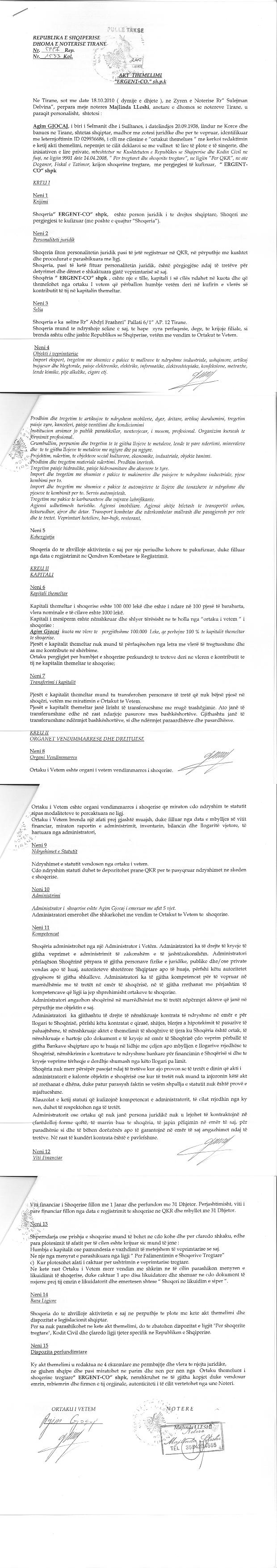 | Shoqëri Mëmë / Zotërues për këtë Subjekt: | “CONCORD INVESTMENT”, shoqëri me përgjegjësi të kufizuar e se drejtës shqiptare, e themeluar me datë 16/05/2005, me NIPT K81602049K, me seli qendrore ne Tirane Rruga Perlat Rexhepi, Ndertesa Nr.1, Hyrja 14, Ap.7, Njesia Bashkiake Nr.5, Kodi Postar 1019 dhe me administrator Adrian Dulaku dhe Artan Dulaku. Ortakët e shoqërisë janë Adrian Dulaku 33%, Artan Dulaku 34% dhe Genci Dulaku 33%. (Sipas të dhënave të QKB deri me datë 22.06.2023) Sipas Ekstraktit Historik te Regjistrit te Pronarit Perfitues, date 27.12.2022 terhequr nga QKB date 22.06.2023, Pronaret perfitues te subjektit “ERGENT-CO”, zoterues te 25% te kapitalit e me teper, jane: Arian Kraja, shtetas shqiptar, i datelindjes 1965, pronar perfitues per 25% te kapitalit. Data e percaktimit si pronar perfitues eshte 06.01.2017. Artan Dulaku, shtetas shqiptar, i datelindjes 1965, pronar perfitues per 25.5% te kapitalit, pasi zotëron 34% të kapitalit të shoqërisë “CONCORD INVESTMENT”, dhe kjo e fundit zotëron 75% të kapitalit të shoqërisë “ERGENT-CO”. Data e percaktimit si pronar perfitues eshte 16.06.2021. Adrian Dulaku, shtetas shqiptar, i datelindjes 1960, pronar perfitues per 24.75% te kapitalit, pasi zotëron 33% të kapitalit të shoqërisë “CONCORD INVESTMENT”, dhe kjo e fundit zotëron 75% të kapitalit të shoqërisë “ERGENT-CO”. Data e percaktimit si pronar perfitues eshte 16.06.2021. Genci Dulaku, shtetas shqiptar, i datelindjes 1967, pronar perfitues per 24.75% te kapitalit, pasi zotëron 33% të kapitalit të shoqërisë “CONCORD INVESTMENT”, dhe kjo e fundit zotëron 75% të kapitalit të shoqërisë “ERGENT-CO”. Data e percaktimit si pronar perfitues eshte 16.06.2021. |
