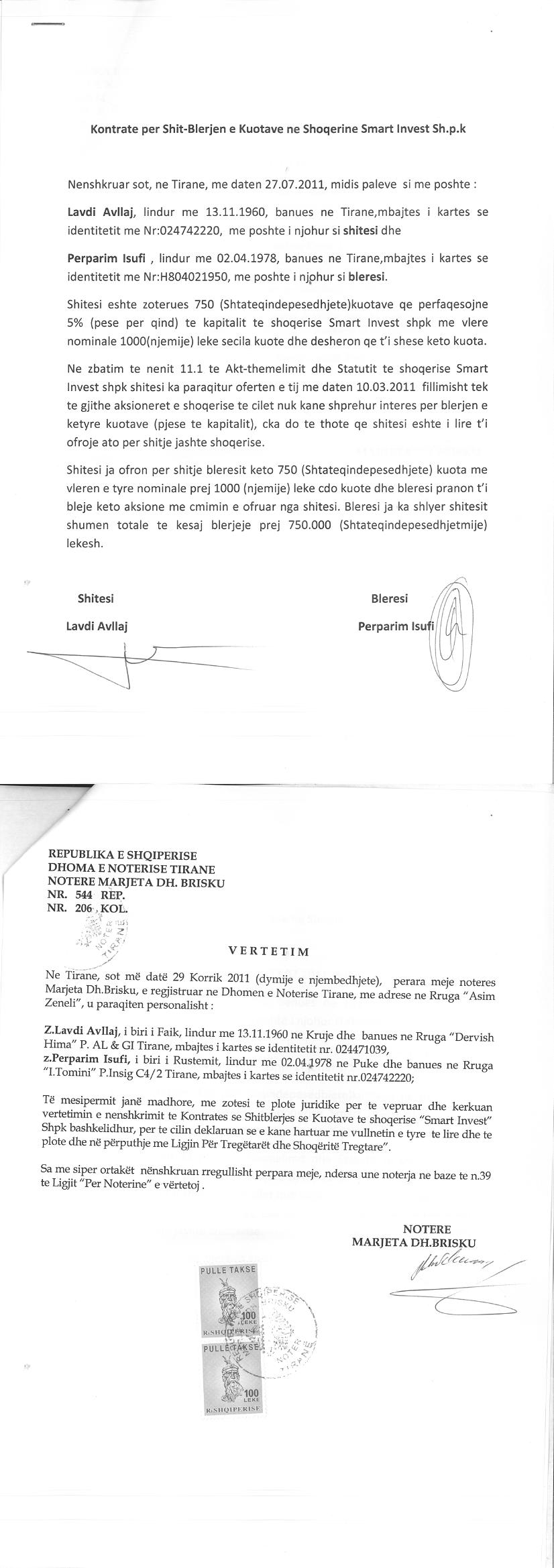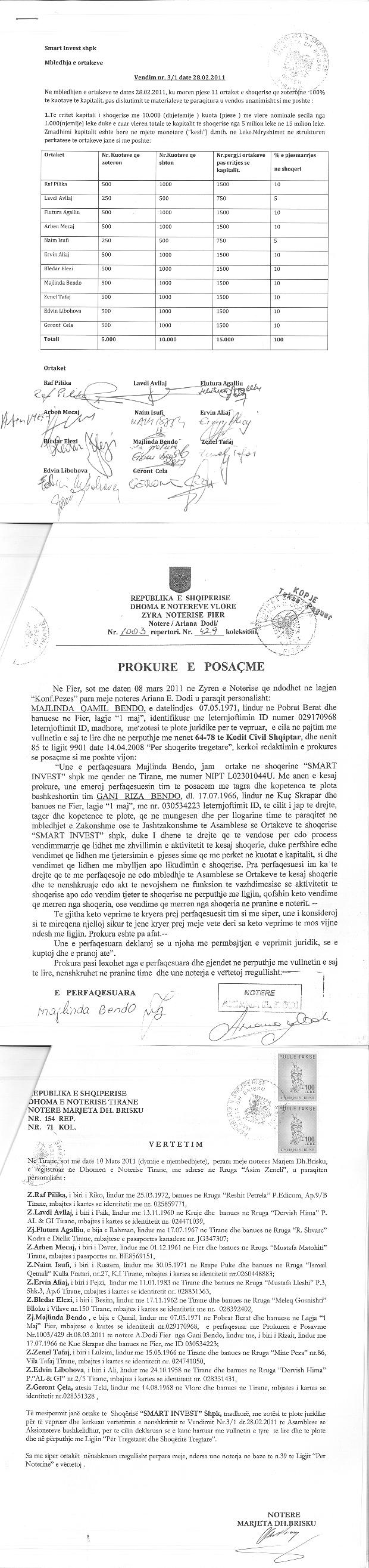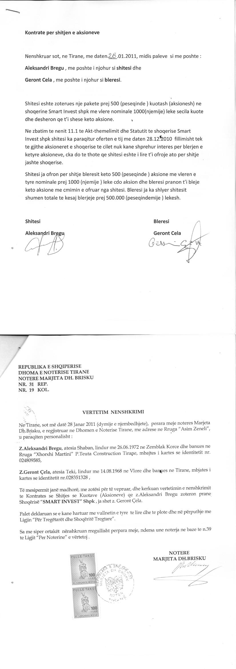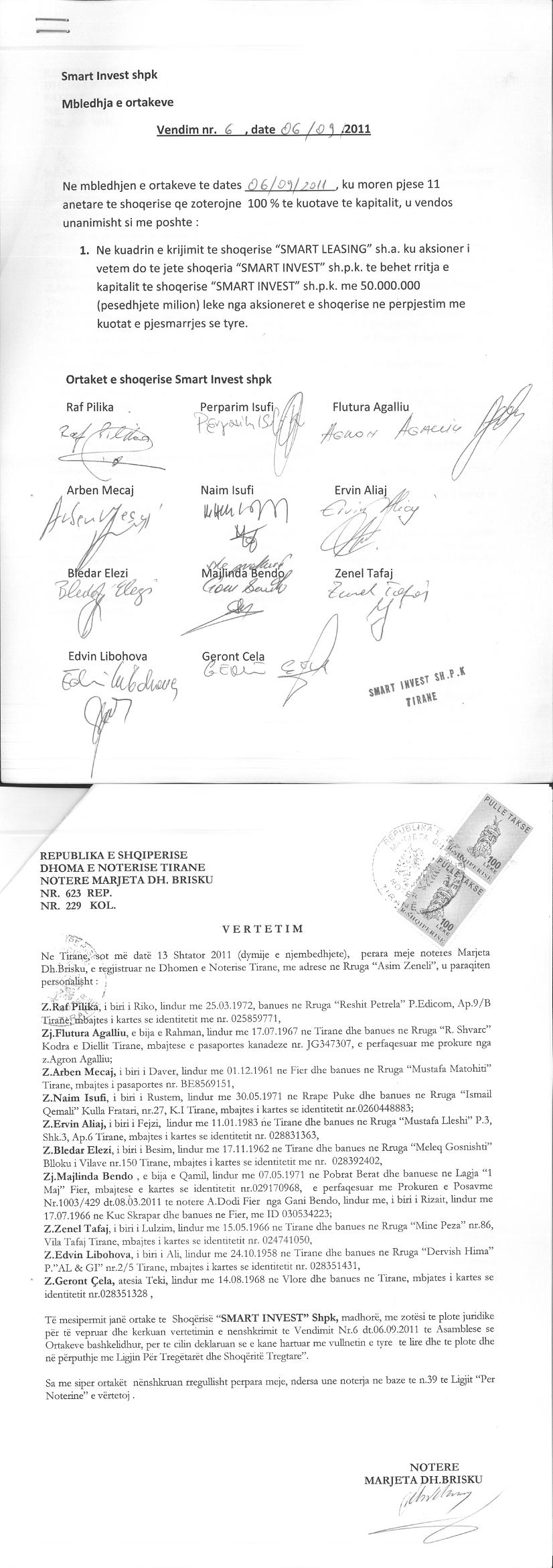 → Ekstrakt Historik i Regjistrit Tregtar date 14.03.2025 → Kontratë Shitje Aksionesh datë 28.01.2011 → Vendim i Asamblesë së Ortakëve për Zmadhimin e Kapitalit datë 28.02.2011 → Kontratë Shitblerje Kuotash datë 27.07.2011 → Vendim i Asamblesë së Ortakëve për Zmadhimin e Kapitalit datë 06.09.2011 → Vendim i Asamblesë së Ortakëve për Zvogëlimin e Kapitalit datë 06.09.2012 → Kontratë Shitje Aksionesh datë 18.09.2012 |