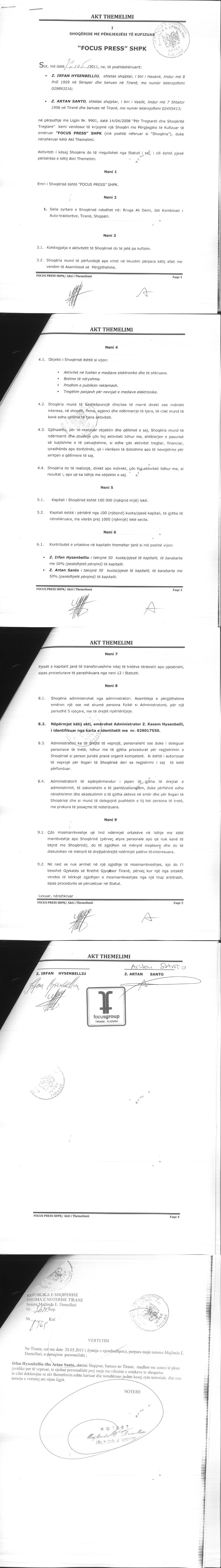 | Shoqëri Mëmë / Zotërues për këtë Subjekt: | "FOCUS GROUP", shoqëri me përgjegjësi të kufizuar e se drejtës shqiptare, e themeluar me 15/04/2011 me NIPT L11618006J me seli qendrore ne Tirane, Njesia Bashkiake nr.9, Rruga Panorama, kulla Biznesit, kodi Postar 1016 dhe administrator Folitjona Puravelli. Ortak i vetem i shoqerise eshte Irfan Hysenbelliu. (Sipas te dhenave te QKB deri me date 26.05.2023) Sipas Ekstraktit Historik te Regjistrit te Pronarit Perfitues, date 25.03.2021 terhequr nga QKB date 26.05.2023, Pronaret perfitues te subjektit “FOCUS PRESS”, zoterues te 25% te kapitalit e me teper, eshte: Irfan Hysenbelliu, shtetas shqiptar, i datelindjes 1959, pronar perfitues per 100% te kapitalit, pasi zoteron 100% te kapitalit te shoqerise meme " FOCUS GROUP ", ndersa shoqeria " FOCUS GROUP " zoteron 100% te kapitalit tek “FOCUS PRESS”. Data e percaktimit si pronar perfitues eshte 28.05.2011. |