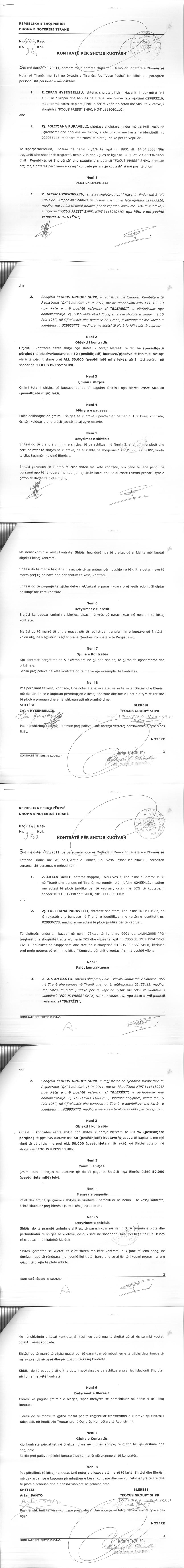 | Çështje Ligjore: | Me datë 28.12.2018, u lidh Marreveshja Siguruese, Nr. 10461 Rep. Nr. 3687 Kol.. midis FOCUS GROUP (Barrdhenes) dhe Banka Credins sh.a (Barremarres/Kredidhenes) me objekt vendosje barre barre mbi 100% te kuotave dhe te drejtave ne lidhje me to qe zoteron FOCUS GROUP sh.p.k ne shoqerine FOCUS PRESS sh.p.k si dhe mbi kuotat e reja qe mund te zoteroje ne te ardhmen ne kete shoqeri tregtare. |
