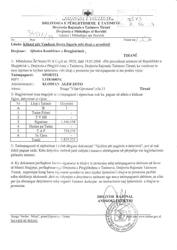 | Çështje Ligjore: | I. Me date 05.06.2014, me ane te kërkesës për vendosje barre sigurie mbi titujt e pronësisë Nr. 34911/34 Prot, lëshuar nga Drejtoria Rajonale Tatimore Tiranë, u kerkua te mos lejohet tjetërsimi i titujve të pronësisë përfshire edhe shitblerje aksionesh të subjektit SPORTEL sh.p.k pajisur me NUIS (NIPT) – L11814005K me administrator Z. Klodian Zoto, deri në shlyerjen e detyrimeve tatimore nga ana e tatimpaguesit debitor. II. Me date 04.11.2014, me ane te kërkesës për vendosje barre sigurie mbi titujt e pronësisë Nr. 81108 Prot, lëshuar nga Drejtoria Rajonale Tatimore Tiranë u kerkua te mos lejohet tjetërsimi i titujve të pronësisë përfshire edhe shitblerje aksionesh të subjektit “SPORTEL” pajisur me NUIS (NIPT) – L11814005K me administrator Z. Klodian Zoto, deri në shlyerjen e detyrimeve tatimore nga ana e tatimpaguesit debitor. III. Me datë 20.09.2022, Bazuar në nenin 15/1 të ligjit Nr. 6/2022 "Për Disa Ndryshime dhe Shtesa në Ligjin Nr.112/2020, Për Regjistrin e Pronarëve Përfitues", i ndryshuar, QKB për subjektet raportuese, të cilat kryejnë shkeljet e parashikuara në pikën 4 të këtij neni, do të ndryshojë statusin nga “AKTIV” në statusin “PEZULLUAR” deri në pagesën e gjobës dhe regjistrimin e të dhënave përkatëse për pronarët përfitues. Statusi i shoqërisë ishte "Aktiv" u be "Pezulluar". |