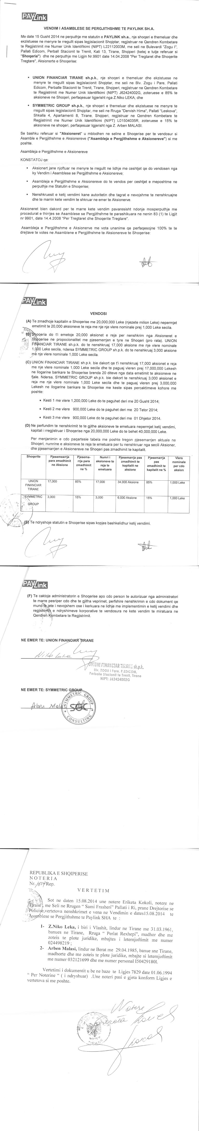 | Shoqëri Mëmë / Zotërues për këtë Subjekt: | UNION FINANCIAR TIRANE, nje shoqeri aksionare, e themeluar me date 15.02.1995 sipas ligjeve te Republikes se Shqiperise, me numer identifikimi biznesi NIPT J62424002G, me adrese ne Tirane, Rruga ''Ismail Qemali'', Nr.32, Kati 3, Kodi Postar 1019, Njësia Bashkiake Nr.5, me administrator Elton Çollaku. Aksionaret jane: Eduard Shima (10%), Gjergj Misha (10%), Varuzhan Piranjani (10%), Niko Leka (35%) dhe Edmond Leka (35%). (Sipas te dhenave te QKB deri me date 10.07.2023) Sipas Ekstraktit Historik te Regjistrit te Pronarit Perfitues, date 19.03.2021 terhequr nga QKB date 10.07.2023, Pronaret perfitues te subjektit “PAYLINK”, zoterues te 25% te kapitalit e me teper, janë: Edmond Leka, shtetas shqiptar, i datelindjes 1963, pronar perfitues per 35% te kapitalit, pasi zotëron 35% të kapitalit të shoqërisë “UNION FINANCIAR TIRANE”, dhe kjo e fundit zotëron 100% të kapitalit të shoqërisë “PAYLINK”. Data e percaktimit si pronar perfitues eshte 11.09.2012. Niko Leka, shtetas shqiptar, i datelindjes 1961, pronar perfitues per 35% te kapitalit, pasi zotëron 35% të kapitalit të shoqërisë “UNION FINANCIAR TIRANE”, dhe kjo e fundit zotëron 100% të kapitalit të shoqërisë “PAYLINK”. Data e percaktimit si pronar perfitues eshte 11.09.2012. |