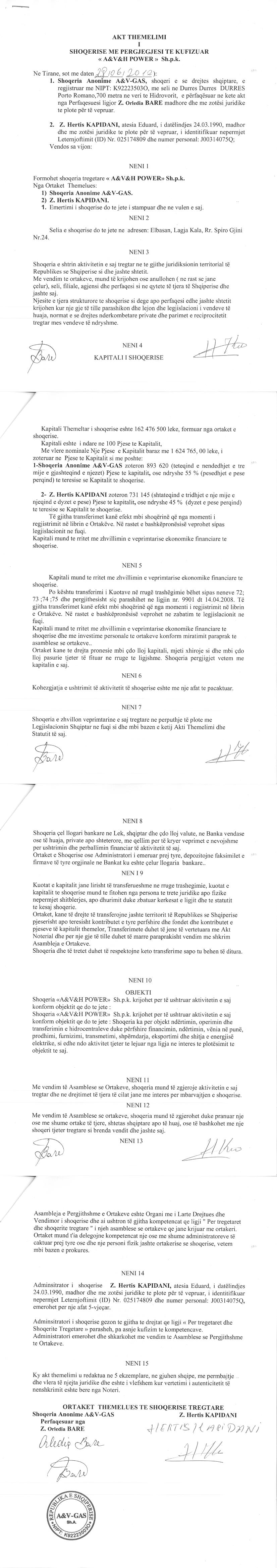 Shoqëri e Kontrolluar nga ky Subjekt: QUKES POWER, është një shoqëri me përgjegjësi te kufizuar koncesionare, themeluar me 22.09.2011, me numër identifikimi në regjistrin tregtar NIPT L13323202J, me seli qendrore ne Elbasan, Lagjia 29,Nentori,Bulevardi Qemal Stafa,Pallati 109/1 dhe me ortake HERTIS (43.5%), A&H&V POWER (13%) dhe CARAGLIO (43.5%). (Sipas Ekstraktit Historik te Shoqerise date 17.05.2024) .
