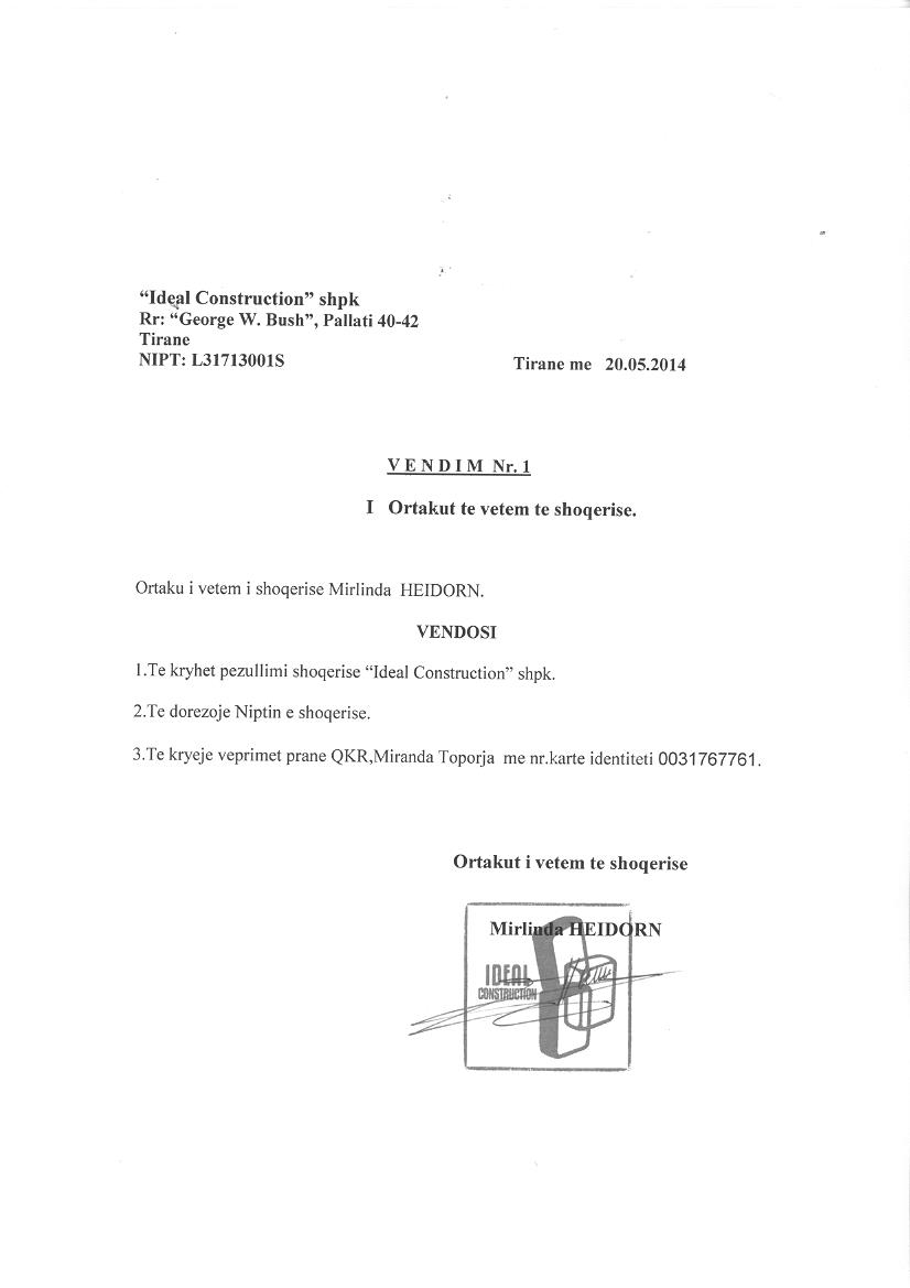 → Ekstrakt historik i regjistrit tregtar date 01.10.2022 → Akti i themelimit → EKSTRAKT HISTORIK I REGJISTRIT TË PRONARIT PËRFITUES date 01.10.2022 → Vendim i ortakut te vetem per pezullimin e aktivitetit 20.05.2014 → Vendimi i ortakut te vetem per aktivizimin e shoqerise 24.04.2017 → Kontrate shitblerje e kuotave te kapitalit themeltar date 12.10.2018 → Kontrate shitje kuotash date 20.03.2020 → Ekstrakti Historik i Regjistrit Tregtar date 19.05.2023 → Ekstrakti Historik i Regjistrit te Pronareve Perfitues date 19.05.2023 → V E N D I M Nr. 6, datë 25.01.2023 “PËR ZHVILLIMIN E PRONËS NR. 2/377, ZONA KADASTRALE 8380, ME EMËRTIMIN “GODINË NJË KATËSHE E DHOMËS SË TREGTISË DHE INDUSTRISË”, NË PRONËSI TË BASHKISË TIRANË DHE MIRATIMIN E DRAFT KONTRATËS SË SIPËRMARRJES MIDIS BASHKISË TIRANË DHE SUBJEKTIT “IDEAL CONSTRUCTION” SH.P.K” → V E N D I M Nr. 58, datë 09.05.2023 “PËR MIRATIMIN E KONTRATËS SË SIPËRMARRJES MIDIS BASHKISË TIRANË DHE SUBJEKTIT “IDEAL CONSTRUCTION” SH.P.K” |