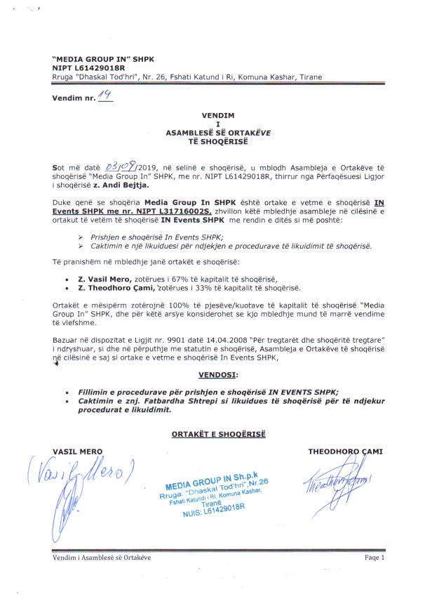 → Ekstrakti Historik i Regjistrit Tregtar date 05.08.2022 → Akt themelimi i Shoqerise → Ekstrakti Historik i Regjistrit te Pronare Perfitues, terhequr date 05.08.2022 → Kontrate Shitje Kuotash date 04.03.2016 → Vendim i Ortakut te Vetem, Likuidim Shoqerie date 03.09.2019 |