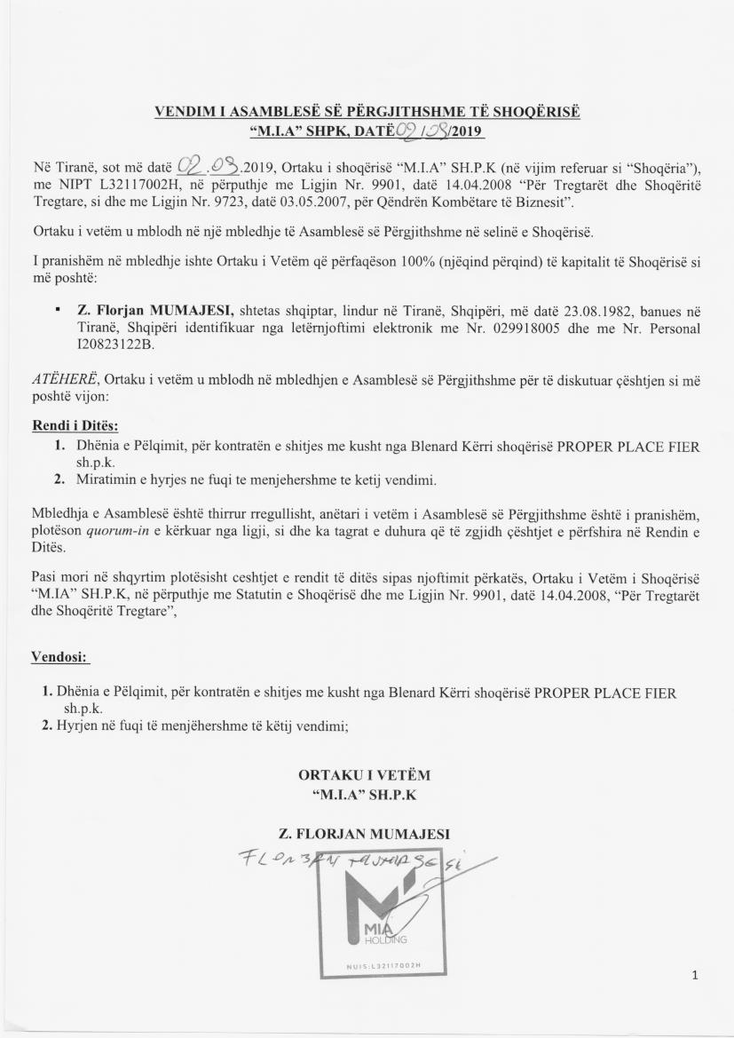 Çështje Ligjore: Me date 04/09/2019, me ane te vendimit, datë 02.09.2019 ku është dhënë pëlqimi për kontratën e shitjes me kusht nga Blenard Kërri shoqërisë PROPER PLACE FIER.