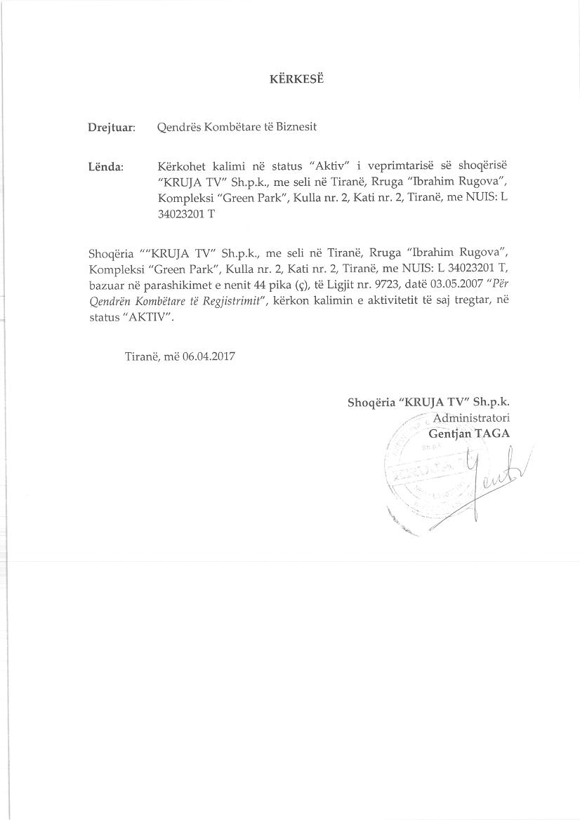 2. Në datën 06.04.2017 u vendos Aktivizimi i Aktivitetit të Shoqërisë. Statusi i shoqërisë ishte “Pezulluar” u bë “Aktiv”.