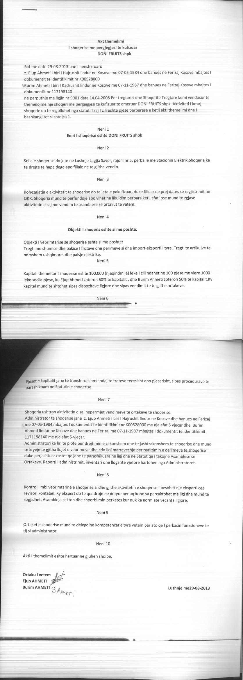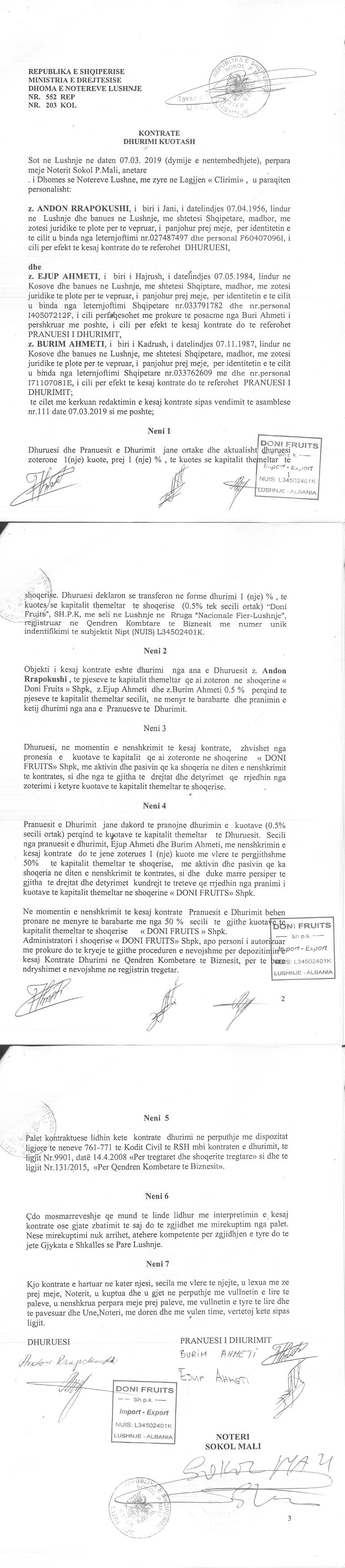 → Ekstrakt Historik i Regjistrit Tregtar date 06.10.2023 → Akt themelimi i Shoqerise → Marrëveshje Siguruese datë 17.11.2017 → Marrëveshje Siguruese datë 12.12.2019 → Marrëveshje Siguruese datë 14.01.2021 → Marrëveshje Siguruese datë 04.10.2021 → Marrëveshje Siguruese datë 26.11.2021 → Marrëveshje Siguruese datë 17.05.2023 → Kontratë Dhurimi datë 28.03.2018 → Kontratë Dhurimi datë 07.03.2019 → Vendim i Asamblesë së Ortakëve, Ndryshimi i Shtetësisë së Ortakëve të Shoqërisë datë 18.03.2019 → Urdhër për Vënien e Sekuestros datë 26.04.2021 → Urdhër për Heqjen e Sekuestros datë 19.05.2021 → Pasqyra e te ardhurave dhe shpenzimeve 2018 → Ekstrakt Historik i Regjistrit Tregtar date 17.04.2024 → Urdhër për Vënien e Sekuestros datë 09.10.2023 → Urdhër për Heqjen e Sekuestros datë 01.12.2023 → Vendim i Asamblesë së Ortakëve, Zmadhim Kapitali datë 06.11.2023 → Kontratë për Shitjen e Kuotës datë 18.12.2023 → Vendim i Asamblesë së Përgjithshme, Zmadhim Kapitali datë 29.01.2024 → Të dhënat e Investimit, Financimet Nga IPARD - Aksesuar nga Agjencia për Zhvillim Bujqësor dhe Rural AZHBR datë 17.04.2024 → Ekstrakt historik i regjistrit tregtar date 11.10.2025 → Ekstrakt i regjistrit te pronareve perfitues date 11.10.2025 |