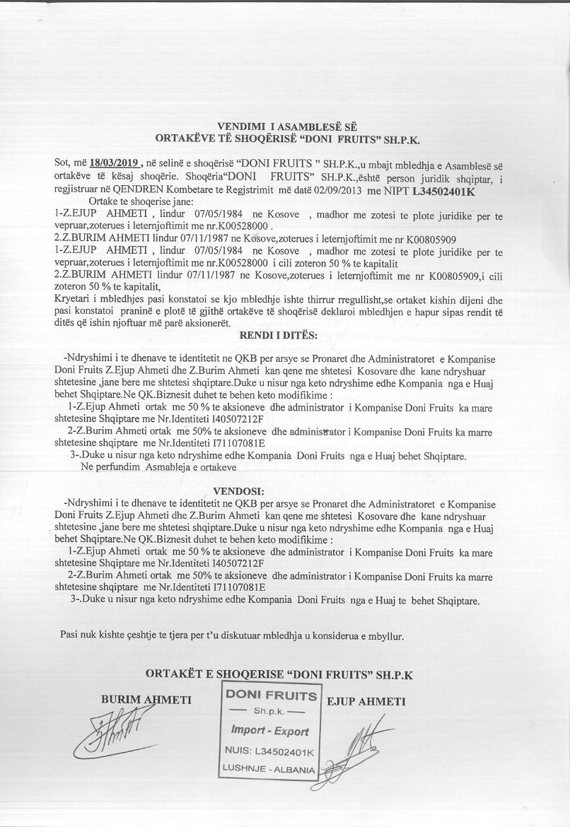 QKB për: Sekuestrimin e aktiveve të shoqërisë '' DONI FRUITS '' shpk me Nipt