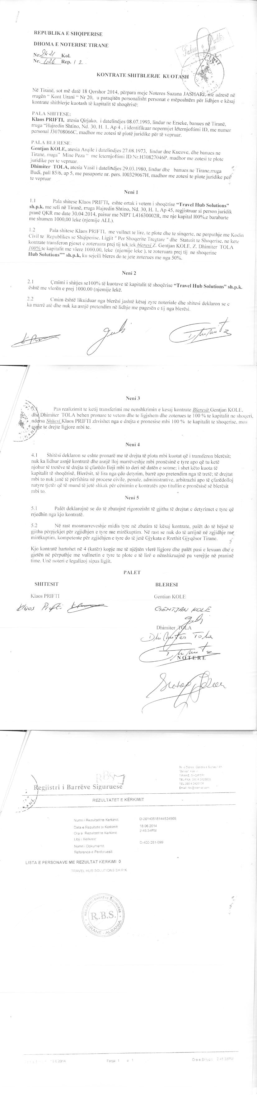 → Ekstrakt Historik i Regjistrit Tregtar date 24.04.2024 → Akt themelimi i Shoqerise → Kontratë Shitblerje Kuotash datë 18.06.2014 → Kontratë për Shitblerje Kuotash datë 06.06.2017 → Kontratë për Shitjen e Kuotës datë 17.01.2024 |