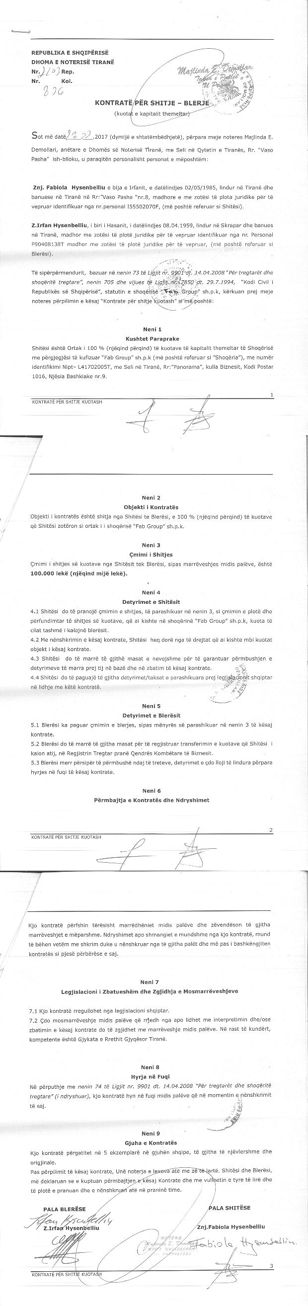 → Ekstrakti Historik i Regjistrit Tregtar date 06.11.2021 → Akti i themelimit te Shoqerise → Kontrate e Shit-Blerjes se Kuotave date 28.03.2017 → Vendim i Asamblese se Pergjithshme per rritjen e kapitalit date 28.04.2017 → Vendim i Asamblese se Pergjithshme per rritjen e kapitalit date 21.06.2019 → Vendim i Asamblese se Pergjithshme per rritjen e kapitalit date 17.07.2020 → Ekstrakt Historik i Regjistrit Tregtar date 12.04.2023 → Vendim i Asamblesë së Përgjithshme, Zmadhim Kapitali datë 28.02.2022 |