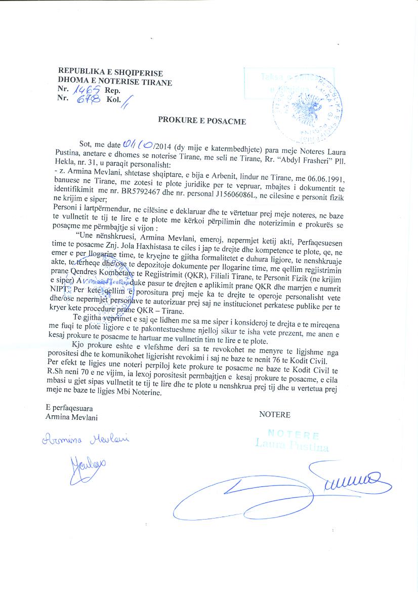 → Ekstrakti Historik i Regjistrit Tregtar date 08.06.2023 → Prokure e Posacme date 01.10.2014 |
