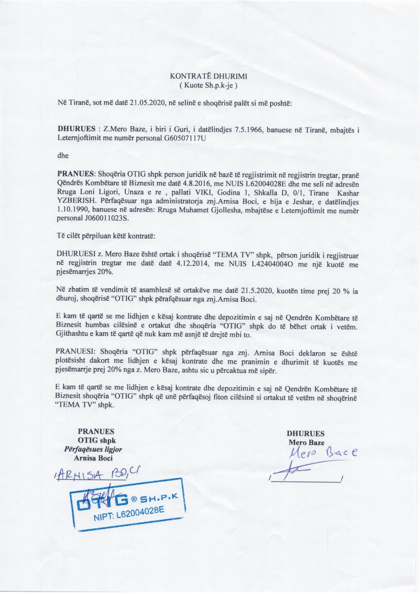 | Objekti i Veprimtarisë: | Shoqeria ka per objekt kryesor veprimtarie kryerjen e cfaredolloj aktiviteti ne fushen e mediave televizive, nepermjet cfaredolloj platforme teknike ose teknologjie, qofte kjo on-line, dixhitale, tokesore ose satelitore, si dhe te cfaredolloj veprimtarie tjeter te komplementare ose te lidhur, plotesuese apo te dobishme, duke permendur ketu pa u kufizuar marketingun, sherbime, konsulence, administrative etj. Shoqeria mund te marre pjese me financime ose ne menyre operative ne consortium–e edhe te perkohshme, joint venture ose te zoteroje, te bleje ose te shese pjesemarrje ne ente, shoqeri apo ndermarrje, edhe ne faze themelimi qe kane qellime te ngjashme, ose komplementare; jo si aktivitet paresor, Shoqeria mund edhe te jape garanci reale dhe/ose personale, te vendose pengje, te dale dorezanese apo te vendose hipoteke edhe ne favor te te treteve. Gjithashtu, Shoqeria mund te kryeje cdo veprim apo operacion tjeter qe ka te beje me pronen e paluajtshme apo te luajtshme, cdo veprim apo operacion tjeter tregtar, industrial e financiar, te dobishem apo plotesues, me qellim permbushjen e objektit te Shoqerise si edhe cdo aktivitet tjeter te lejuar nga ligji. |