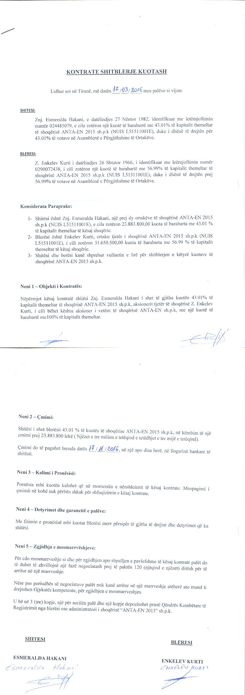 → Ekstrakt historik i regjistrit tregtar date 15.04.2022 → Akti i themelimit te shoqerise → Vendim per zmadhimin e kapitalit te shoqerise 09.04.2015 → Vendimi per korigjimin e zmadhimit te kapitalit 18.05.2015 → Kontrate shit-blerje kuotash 17.03.2016 → Kontrate pengu 29.03.2016 → Marreveshje siguruese 28.12.2017 → Ekstrakti Historik i Regjistrit Tregtar date 28.03.2024 |