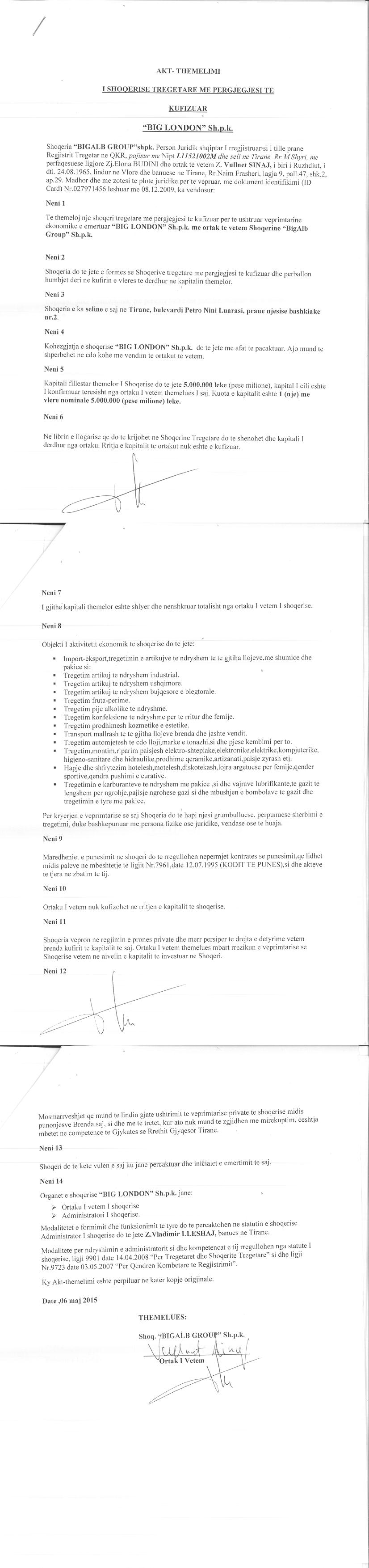 | Shoqëri Mëmë / Zotërues për këtë Subjekt: | I. “BIGALB GROUP”, shoqëri me përgjegjësi të kufizuar, e themeluar më datë 17/03/2011, sipas ligjeve të Republikës së Shqipërisë, me numër identifikimi në regjistrin tregtar NIPT L11521002M, me adresë në aktuale në Tirane Vaqarr GROPAJ Fshati Gropaj, Godina Tirana Cash & Carry, Kati 2, Vaqarr, dhe me administrator Elona Koshi. Ortak i vetëm i shoqërisë është Vullnet Sinaj (zoterues pasiv), zotërues për 100% të kapitalit. (Sipas të dhënave të QKB deri më datë 30.08.2024) II. “B-IdealGroup”, shoqëri me përgjegjësi të kufizuar, e themeluar më datë 16/05/2023, sipas ligjeve të Republikës së Shqipërisë, me numër identifikimi në regjistrin tregtar NIPT M31722025S, me adresë në aktuale në Tirane Rr Dervish Hima ,Nr pasurie 6/369- N5 Zona Kadastrale 8160 perballe Ambasades Amerikane, dhe me administrator Vladimir Lleshaj. Ortak i vetëm i shoqërisë është Vladimir Lleshaj, zotërues për 100% të kapitalit. (Sipas të dhënave të QKB deri më datë 30.08.2024) Sipas Ekstraktit Historik te Regjistrit te Pronarit Perfitues, depozituar në QKB date 16.04.2024, terhequr datë 30.08.2024, Pronaret perfitues te subjektit “BIG LONDON”, zoterues te 25% te kapitalit e me teper, janë: Vullnet Sinaj, shtetas shqiptar, i datelindjes 1965, pronar perfitues per 40% te pronesise pasi zoteron 100% te kapitalit të “BIGALB GROUP” shpk – shoqëri mëmë për 40% te “BIG LONDON”. Data e percaktimit si pronar perfitues është 08.05.2015. Vladimir Lleshaj, shtetas shqiptar, i datelindjes 1978, pronar perfitues per 40% te pronesise pasi zoteron 100% te kapitalit të “B-IdealGroup” shpk – shoqëri mëmë për 40% te “BIG LONDON”. Data e percaktimit si pronar perfitues është 11.04.2024. |