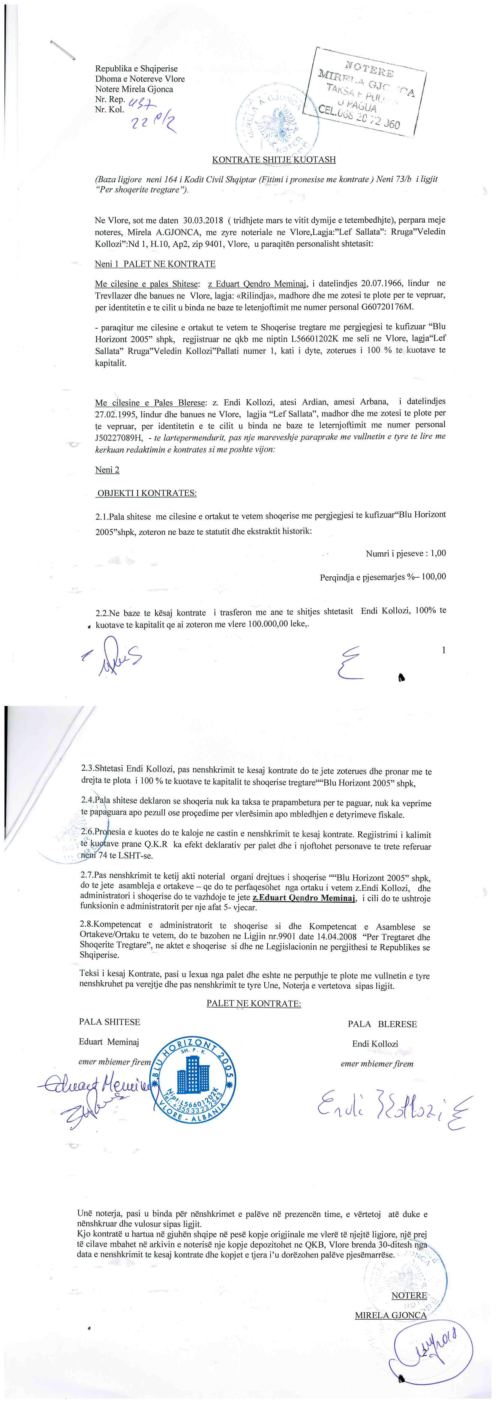 Kontratë Shitje Kuotash Kapitali datë 30.03.2018