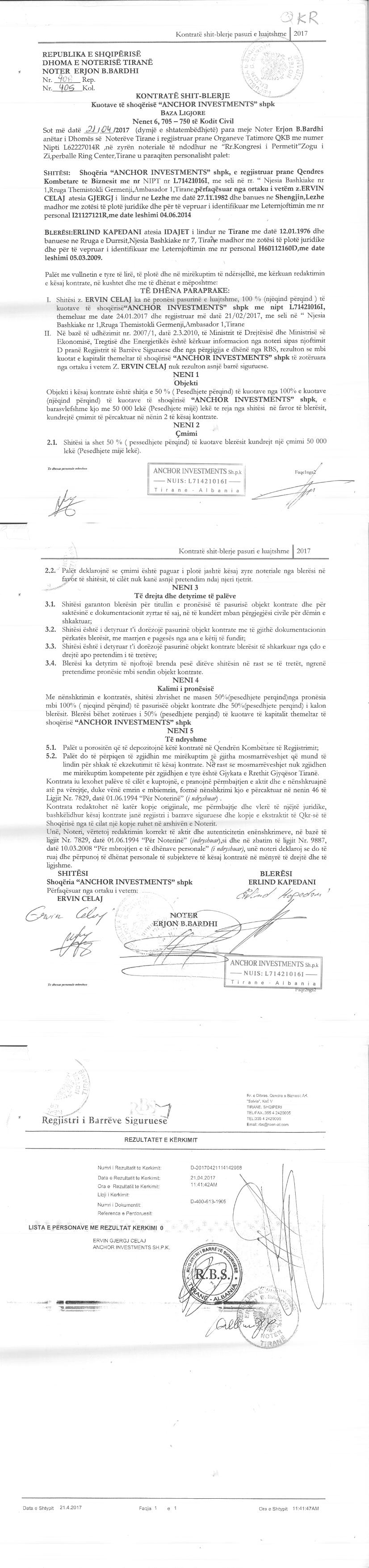 → Ekstrakt Historik i Regjistrit Tregtar date 13.02.2023 → Statuti i Shoqerise → Kontrate Shitblerje Kuotash date 21.04.2017 → Kontrate Shitje Kuotash date 27.11.2018 → Kontrate Dhurimi Kuotash date 25.06.2019 → Kontrate Dhurimi Kuotash date 07.08.2019 → Vendim i Ortakut te Vetem, Zmadhim Kapitali date 24.06.2021 |