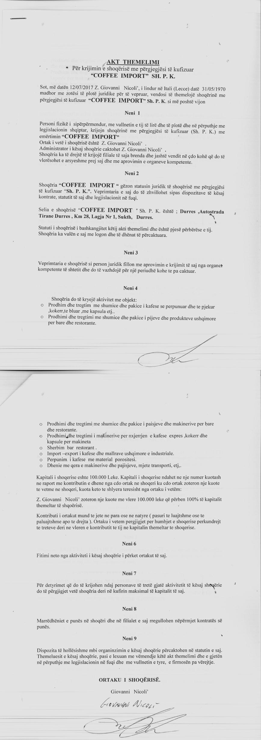 | Objekti i Veprimtarisë: | Prodhim dhe tregim me shumice dhe pakice i kafese se perpunuar dhe te pjekur, kokerr, te bluar, me kapsula etj. Prodhimi dhe tregtimi me shumice dhe pakice i pijeve dhe produkteve ushqimore per bare dhe restorante. Prodhimi dhe tregtimi me shumice i pajisjeve dhe makinerive per bare dhe restorante. Prodhimi dhe tregtimi i makinerive per nxjerrjen e kafese expres, kokerr dhe kapsule per makineta. Sherbim bar restorant. Import-eksport i kafese dhe mallrave ushqimore e industriale. Perpunim i kafese me material porositesi. Dhenie me qera e makinerive dhe pajisjeve, mjete transporti etj. Import, furnizim e tregtim me shumice e pakice te pijeve alkolike. |
