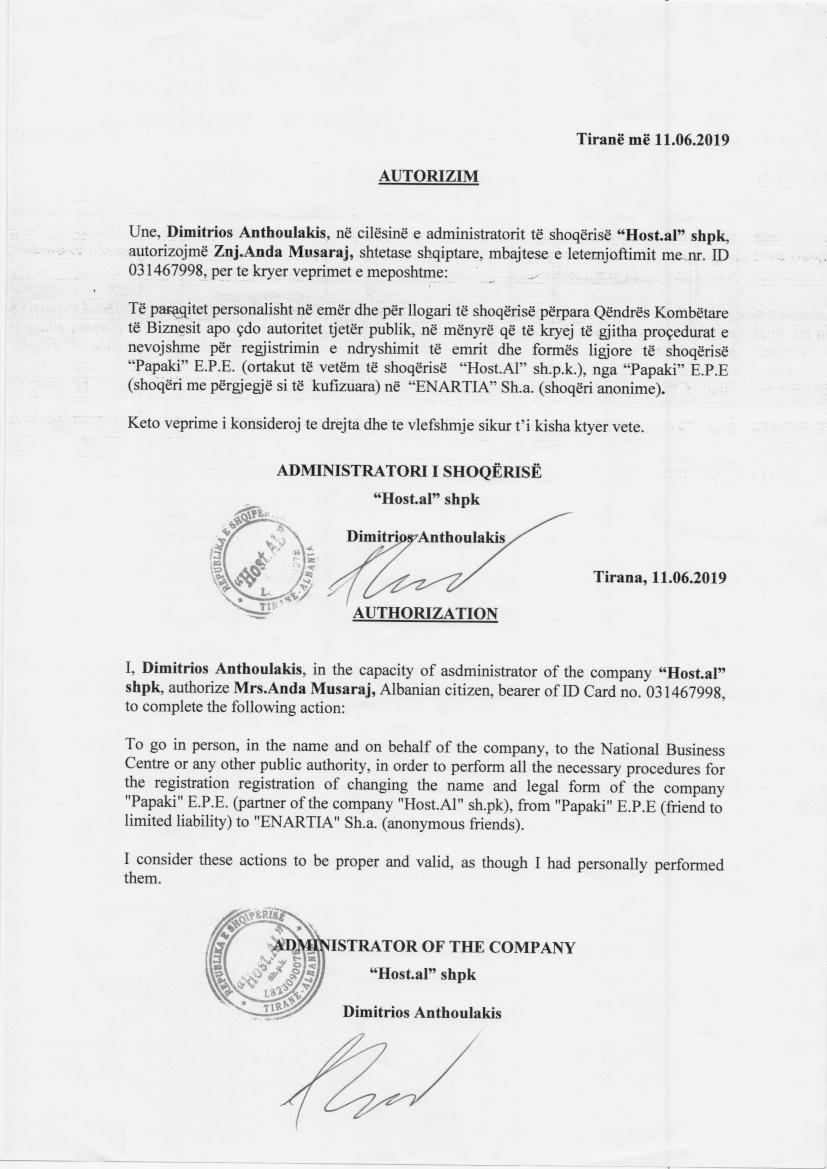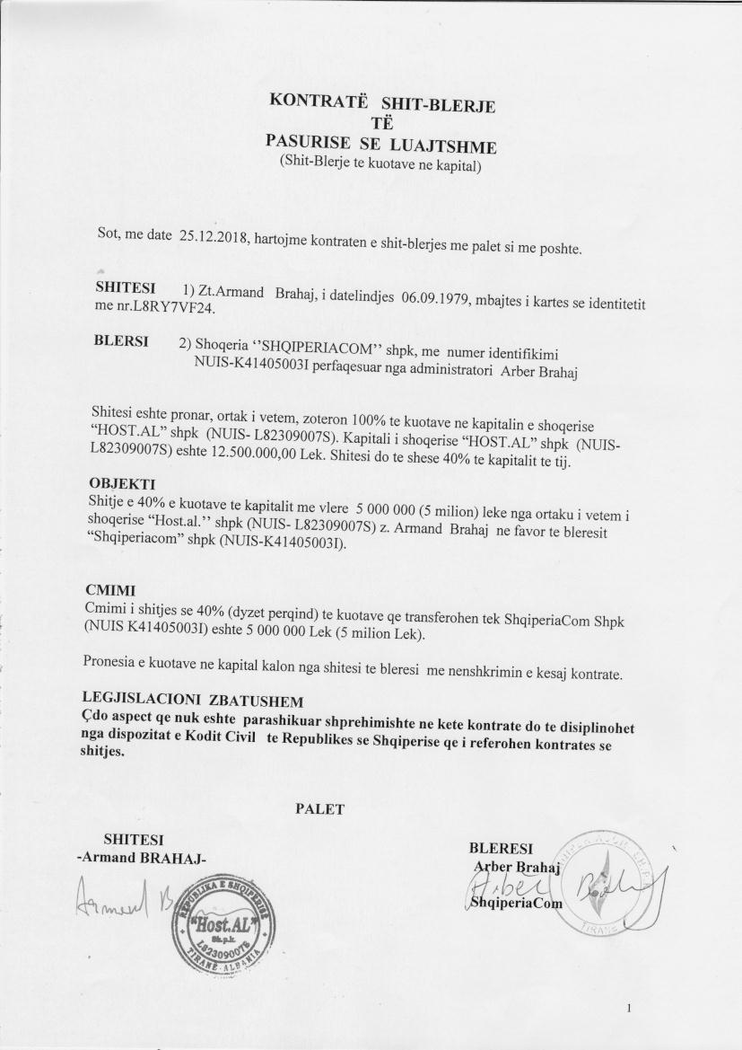 | Shoqëri Mëmë / Zotërues për këtë Subjekt: | New Ventures, është një shoqëri me përgjegjësi të kufizuar e themeluar sipas ligjeve të Republikës së Shqipërisë me date 05.06.2019, me numër identifikimi në regjistrin tregtar NIPT L91806048H, me seli qendrore ne Tirane, Njesia Bashkiake nr.9, Rruga "Asim Vokshi", Pallati 13 kate, Shkalla 25, Kati 3 dhe me ortak te vetëm Armand Brahaj. (Sipas Ekstraktit Historik te Shoqerise date 18.12.2023) . Sipas Ekstraktit Historik te Regjistrit te Pronarit Perfitues, date 26.07.2023, terhequr nga QKB ne daten 18.12.2023 , Pronar perfitues i shoqërisë Host.AL eshte: Armand Brahaj, shtetas gjerman, lindur me 1979, pronar përfitues per 100% te kapitalit, pasi zotëron 100% te kapitalit te shoqërisë New Ventures, e cila eshte shoqëri meme per Host.AL me 100% te kuotave te shoqërisë.Data e percaktimit si pronar perfitues eshte 27.06.2023. |