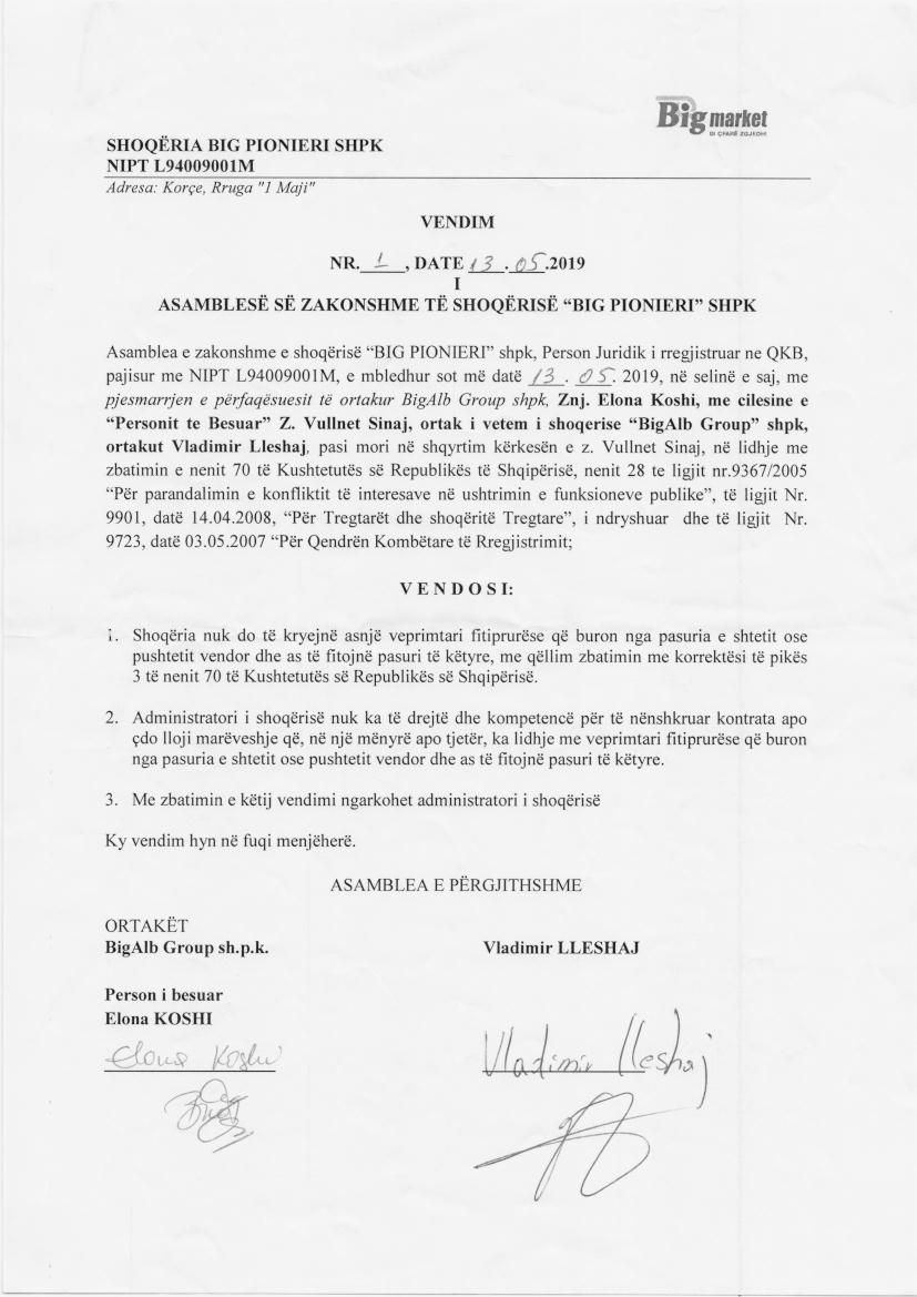 | Shoqëri Mëmë / Zotërues për këtë Subjekt: | I. “BIGALB GROUP”, shoqëri me përgjegjësi të kufizuar, e themeluar më datë 17/03/2011, sipas ligjeve të Republikës së Shqipërisë, me numër identifikimi në regjistrin tregtar NIPT L11521002M, me adresë në aktuale në Tirane Vaqarr GROPAJ Fshati Gropaj, Godina Tirana Cash & Carry, Kati 2, Vaqarr, dhe me administrator Elona Koshi. Ortak i vetëm i shoqërisë është Vullnet Sinaj (zoterues pasiv), zotërues për 100% të kapitalit. (Sipas të dhënave të QKB deri më datë 14.08.2024) II. “B-IdealGroup”, shoqëri me përgjegjësi të kufizuar, e themeluar më datë 16/05/2023, sipas ligjeve të Republikës së Shqipërisë, me numër identifikimi në regjistrin tregtar NIPT M31722025S, me adresë në aktuale në Tirane Rr Dervish Hima ,Nr pasurie 6/369- N5 Zona Kadastrale 8160 perballe Ambasades Amerikane, dhe me administrator Vladimir Lleshaj. Ortak i vetëm i shoqërisë është Vladimir Lleshaj, zotërues për 100% të kapitalit. (Sipas të dhënave të QKB deri më datë 14.08.2024) Sipas Ekstraktit Historik te Regjistrit te Pronarit Perfitues, depozituar në QKB date 05.06.2024, terhequr datë 14.08.2024, Pronaret perfitues te subjektit “BIG Pionieri”, zoterues te 25% te kapitalit e me teper, janë: Vullnet Sinaj, shtetas shqiptar, i datelindjes 1965, pronar perfitues per 51% te pronesise pasi zoteron 100% te kapitalit të “BIGALB GROUP” shpk – shoqëri mëmë për 51% te “BIG Pionieri”. Data e percaktimit si pronar perfitues është 08.04.2019. Vladimir Lleshaj, shtetas shqiptar, i datelindjes 1978, pronar perfitues per 49% te pronesise pasi zoteron 100% te kapitalit të “B-IdealGroup” shpk – shoqëri mëmë për 49% te “BIG Pionieri”. Data e percaktimit si pronar perfitues është 31.05.2024. |