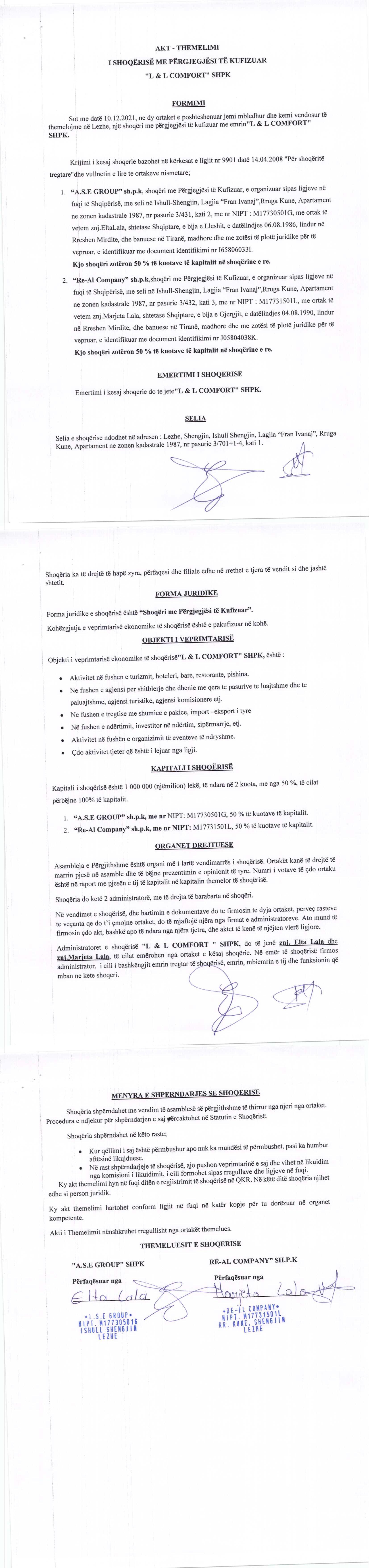 | Shoqëri Mëmë / Zotërues për këtë Subjekt: | I. A.S.E GROUP është një shoqëri me përgjegjësi të kufizuar, e themeluar më datë 16/03/2021 sipas ligjeve të Republikës së Shqipërisë, me numër identifikimi në regjistrin tregtar NIPT M17730501G, me adresë në Lezhe, Shengjin, Ishull- Shengjin,Lagjia “Fran Ivanaj”, Rruga Kune, Apartament ne zonen kadastrale 1987, nr pasurie 3/431, kati2., me administratore dhe ortake te vetme Elta Lala. Sipas të dhënave të QKB deri më date 14.06.2022 II. Re-Al Company është një shoqëri me përgjegjësi të kufizuar, e themeluar më datë 16/03/2021 sipas ligjeve të Republikës së Shqipërisë, me numër identifikimi në regjistrin tregtar NIPT M17731501L, me adresë në Lezhe, Shengjin, Ishull- Shengjin,Lagjia “Fran Ivanaj”, Rruga Kune, Apartament ne zonen kadastrale 1987, nr pasurie 3/432, kati3., me administratore dhe ortake te vetme Marjeta Lala. Sipas të dhënave të QKB deri më date 14.06.2022 Sipas Ekstraktit Historik te Regjistrit te Pronarit Perfitues, date 20.01.2022, terhequr nga QKB date 14.06.2022, Pronaret perfitues te subjektit L & L COMFORT zoterues te 25% te kapitalit e me teper, jane : Elta Lala , shtetase shqiptare, e datelindjes 1986, pronare perfituese per 50% te kapitalit, pasi zoteron 100% te kapitalit te shoqerise meme A.S.E GROUP. Data e percaktimit si pronare perfituese eshte 07.01.2022 Marjeta Lala , shtetase shqiptare, e datelindjes 1990, pronare perfituese per 50% te kapitalit, pasi zoteron 100% te kapitalit te shoqerise meme Re-Al Company. Data e percaktimit si pronare perfituese eshte 07.01.2022 |