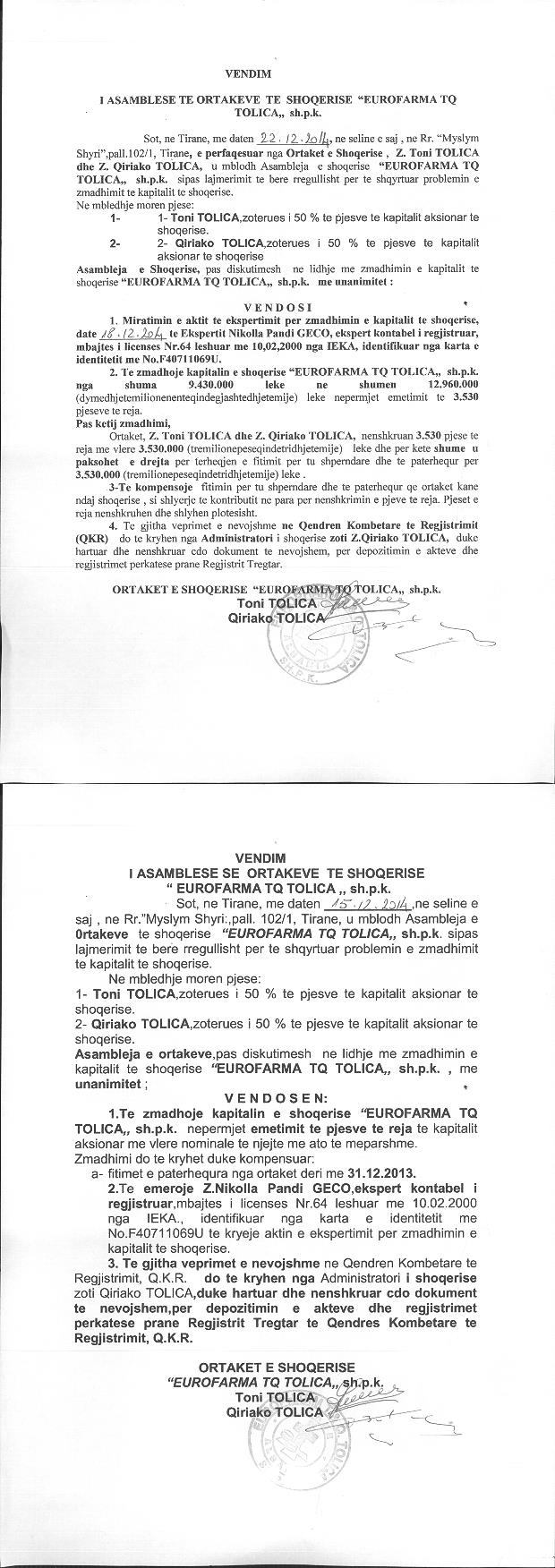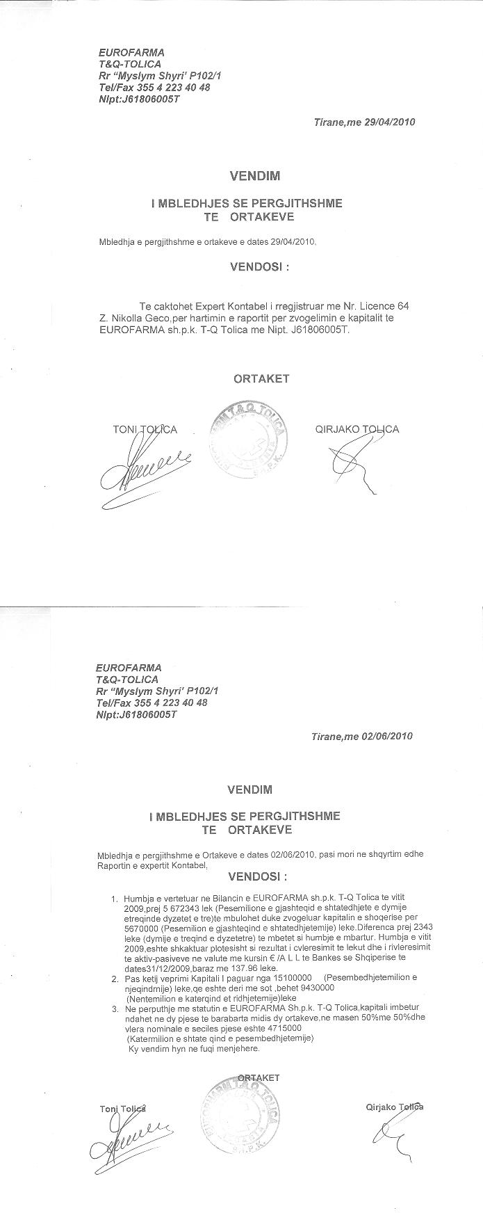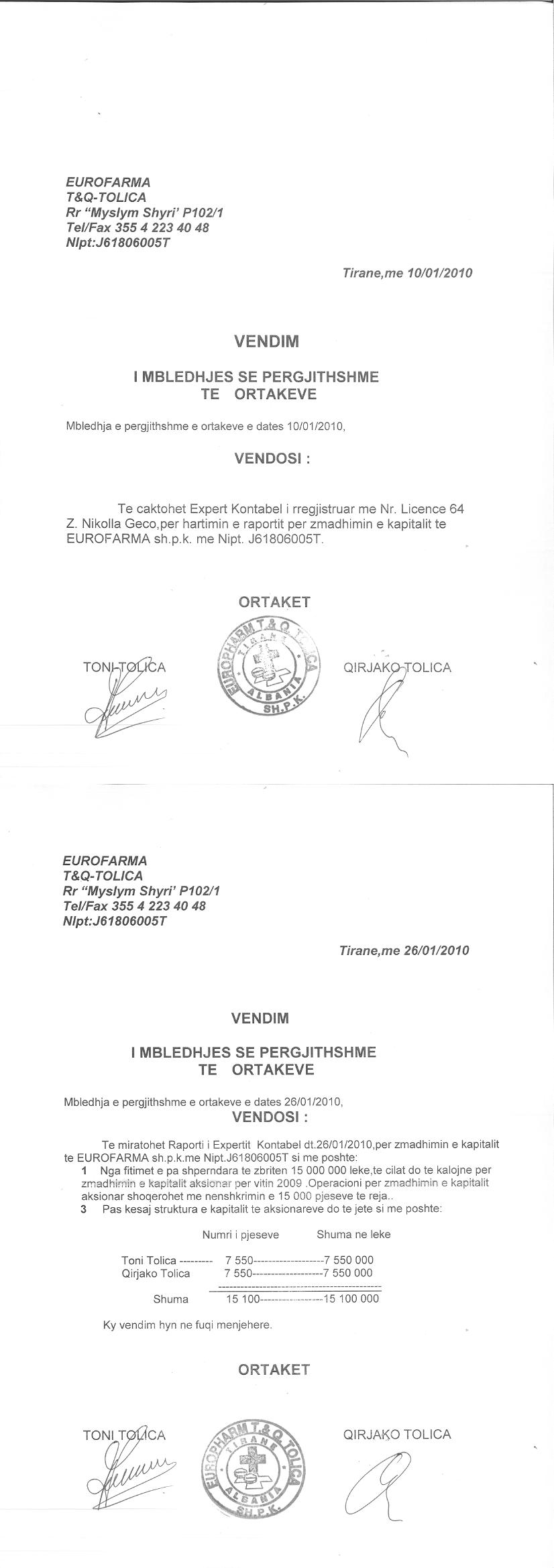 → Ekstrakt Historik i Regjistrit Tregtar date 22.03.2024 → Kontratë themelimi dhe Statut i Shoqërisë → Vendim i Asamblesë së Ortakëve, Zmadhim Kapitali datë 26.01.2010 → Vendim i Asamblesë së Ortakëve, Zvogëlim Kapitali datë 02.06.2010 → Vendim i Asamblesë së Ortakëve, Zmadhim Kapitali datë 22.12.2014 → Vendimi për Lëshimin e Dëshmisë së Trashëgimisë Ligjore për ortakun Toni Tolica datë 19.01.2018 → Kontratë Dhurimi datë 12.09.2020 → Kontratë Dhurimi datë 25.11.2020 |