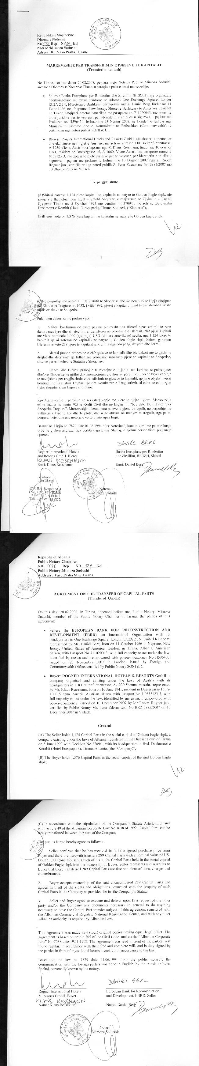 → Ekstrakt Historik i Regjistrit Tregtar date 09.06.2023 → Dokumente të Ndryshme → Vendim për Krijimin dhe Statut i Shoqërisë → Statut i Ndryshuar i Shoqërisë me Emrin e Ri "Golden Eagle" → Vendim i Asamblesë së Ortakëve, Zmadhim Kapitali datë 25.11.2994 → Vendim i Asamblesë së Ortakëve, Zmadhim Kapitali datë 20.02.2000 → Vendim i Ortakëve të Shoqërië, Zvogëlim Kapitali datë 01.12.2009 → Vendim i Ortakëve të Shoqërisë, Zvogëlim Kapitali datë 12.05.2010 → Vendim i Ortakëve të Shoqërisë, Zvogëlim Kapitali datë 31.07.2015 → Kontratë transferimi e Pjesëve të Kapitalit datë 25.05.2004 → Kontratë transferimi e Pjesëve të Kapitalit datë 09.02.2005 → Kontratë transferimi e Pjesëve të Kapitalit datë 13.12.2005 → Marrëveshje për transferimin e Pjesëve të Kapitalit datë 20.02.2008 → Marrëveshje e transferimit të Pjesëve të Kapitalit datë 15.09.2009 → Marrëveshje e transferimit të Pjesëve të Kapitalit datë 22.04.2010 → Marrëveshje e transferimit të Pjesëve të Kapitalit datë 29.06.2010 → Marrëveshje transferimi e Pjesëve të Kapitalit datë 01.10.2010 (a) → Marrëveshje transferimi e Pjesëve të Kapitalit datë 01.10.2010 (b) → Ekstrakt Historik i Regjistrit te Pronareve Perfitues date 09.06.2023 |