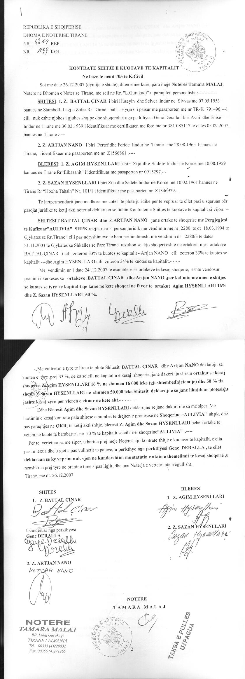 → Ekstrakti Historik i Regjistrit Tregtar date 13.01.2022 → Statuti fillestar i shoqerise dhe dokumenta te ndryshem → Statuti i Shoqerise → Kontrate e shitjes se kuotave date 26.12.2007 → Kontrate e Dhurimit te Kuotave date 05.11.2013 → Ekstrakti Historik i Regjistrit Tregtar date 09.06.2023 |