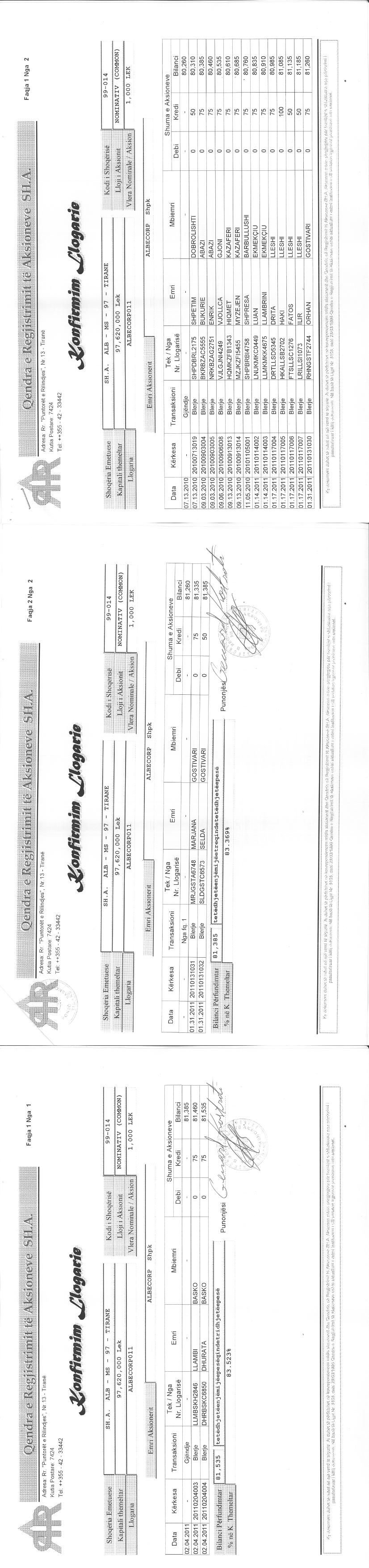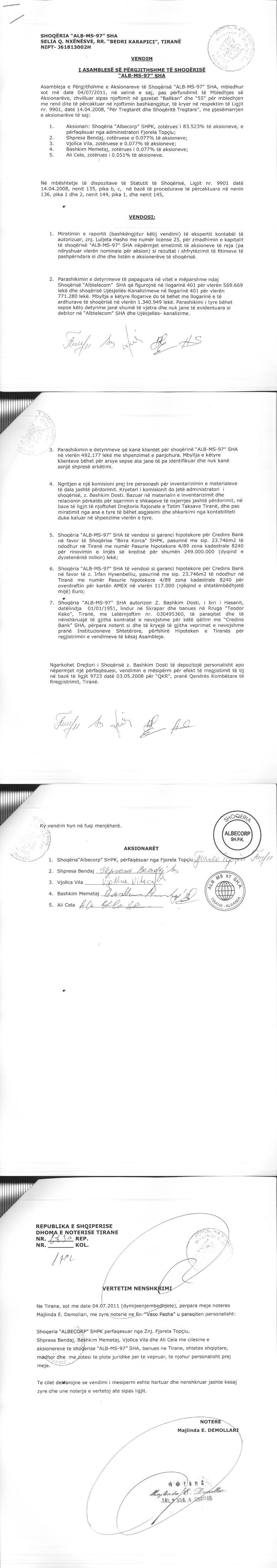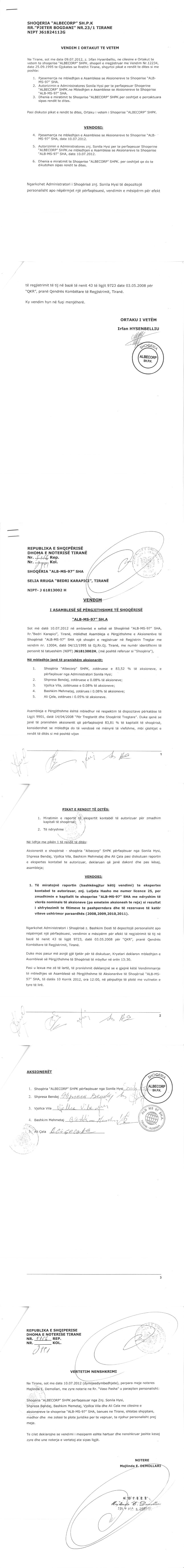 VII. Me datë 15.02.2011, në bazë të dokumentit nga Qendra e Regjistrimit të Aksioneve për konfirmimin e llogarisë, u larguan aksionerët në vijim, duke i transferuar aksionet në favor të “Albecorp” shpk: Shpetim Dobrolishti, Luan Ekmeçiu, Llambi Basko, Ilir Lleshi, Dhurata Basko, Llambrini Ekmeçiu, Marjana Gostivari, Myzejen Kazaferi, Fatos Lleshi, Enrik Abazi, Orhan Gostivari, Shpresa Barbullushi, Haki Lleshi, Selda Gostivari, Hiqmet Kazaferi, Bukurie Abazi, Vjollca Gjoni, Drita Lleshi.