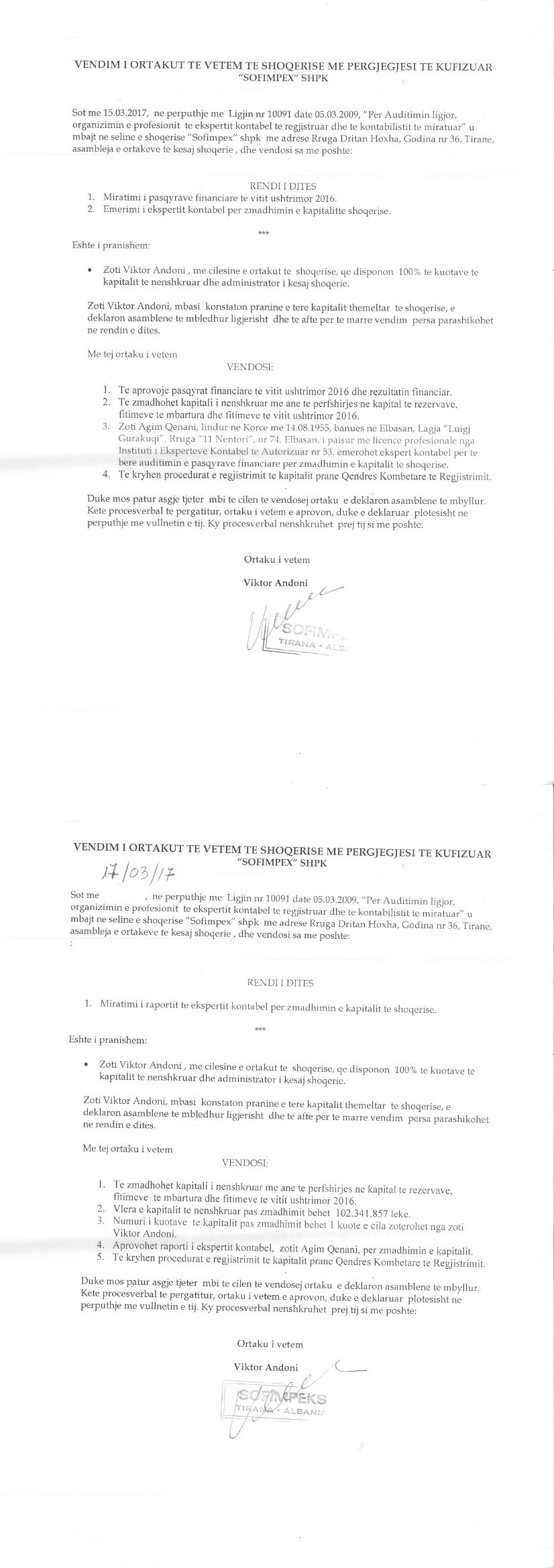 | Çështje Ligjore: | I. Me date 05.10.2016, me vendim te ortakut te vetem, u vendos: Pushim i Perkohshem i Aktivitetit. Statusi i Shoqerise kalon nga "Aktiv" ne "Pezulluar" II. Me date 20/03/2019, me ane te Urdhërit Nr. 273/2 Prot., Nr. 0198-18 Dosje., datë 06.03.2019, protokolluar nga QKB me Nr.4077 Prot., datë 15.03.2019, lëshuar nga shoqëria përmbarimore “De Novo”sh.p.k., u urdherua vendosja e masës së sekuestros konservative në kuotat/ aksionet, e debitorit shoqëria "SOFIMPEKS" sh.p.k., me Nuis (Nipt)- J61813054M, me administrator Z. Viktor Andoni, me si dhe mbi të drejtat që rrjedhin nga zotërimi i këtyre kuotave/aksioneve duke ndaluar tjetërsimin dhe/ose disponimin e tyre si dhe mos kryerjen e asnjë veprimi tjetër i cili mund të ndryshojë të dhënat e regjistrit tregtar. Dokumentacioni do të qëndrojë i bllokuar deri në një urdhër të dytë. III. Me date 28/03/2019, me ane te Urdhrit Nr.375/2 Prot., Nr.0199-18 Regj., date 06.03.2019, lëshuar nga Studio Permbarimore “De Novo”, u urdherua vendosja e mases se sekuestros konservative ne aksionet, kuotat e debitorit, shoqeria "SOFIMPEKS" sh.p.k, me NUIS (NIPT) - J61813054M, administrator Viktor Andoni dhe Viktor Andoni, si dhe mbi te drejtat qe rrjedhin nga zoterimi i ketyre kuotave duke ndaluar tjetersimin dhe/ose disponimin e tyre si dhe mos kryerjen e asnje veprimi tjeter i cili mund te ndryshoje te dhenat e Regjistrit Tregtar. Dokumentacioni do te qendroje i bllokuar deri në një urdhër të dytë. IV. Me date 22/05/2019, me ane te Urdhrit Nr.373/15 Prot., Nr.0198-18 Regj., date 13.05.2019, lëshuar nga Studio Permbarimore “De Novo”, u urdherua heqja e mases se sekuestros konservative mbi aksionet, kuotat e debitorit, shoqeria "SOFIMPEKS" sh.p.k, me NUIS (NIPT) - J61813054M, administrator Viktor Andoni, si dhe mbi të drejtat që rrjedhin nga zotërimi i këtyre kuotave/aksioneve. V. Me date 29/05/2019, me ane te Urdhrit Nr. 375/12 Prot. date 23.05.2019, leshuar nga shoqeria permbarimore DE NOVO Shpk, per heqjen e mases se sekuestros konservative mbi kuotat / aksionet e debitorit, shoqeria SOFIMPEKS Shpk, me NUIS (NIPT) J61813054M, Adm. Vitktor Andoni dhe Viktor Andoni, si dhe mbi te drejtat qe rrjedhin nga zoterimi i ketyre kuotave / aksioneve. VI. Me date 29/09/2020, me ane te Urdhrit Nr.6031 Prot., datë 23.09.2020, protokolluar nga QKB me Nr.8662 Prot., datë 25.09.2020, lëshuar nga Shoqëria Përmbarimore “E.G Bailiff Service” shpk, u urdherua vendosja e masës së sekuestros konservative mbi te gjitha aksionet e zoteruara nga debitori “Sofimpeks ” shpk, me NIPT J61813054M me administrator Viktor Andoni. |