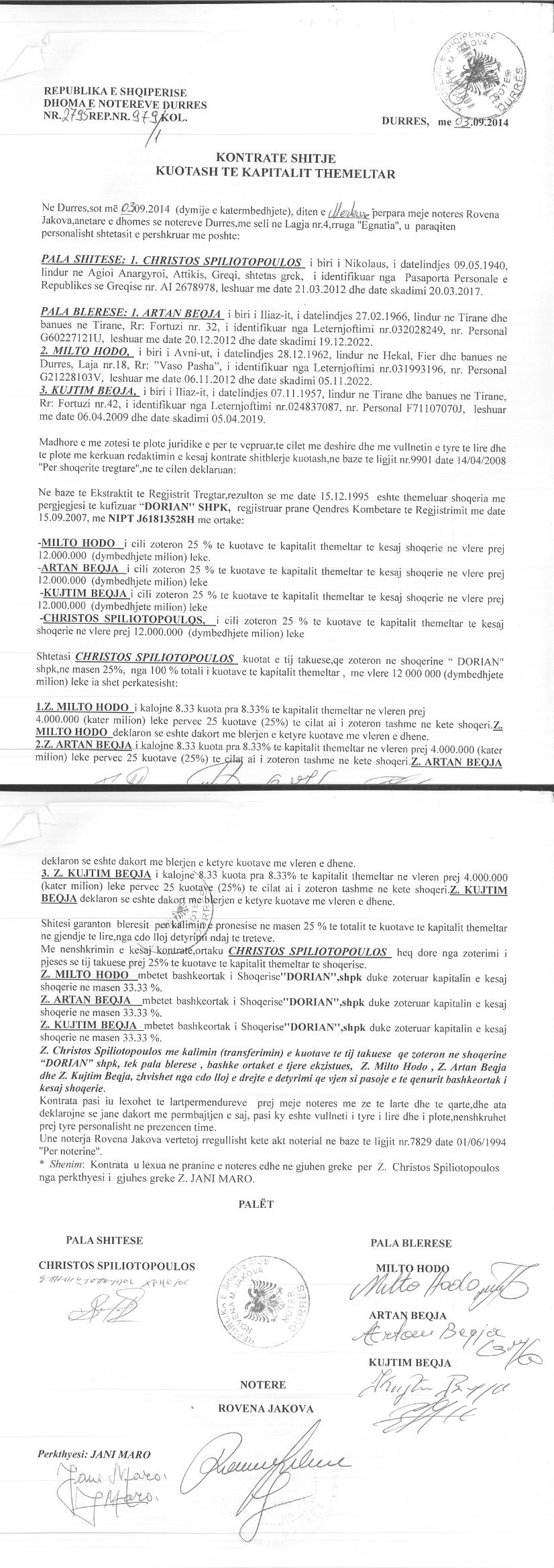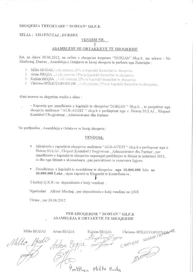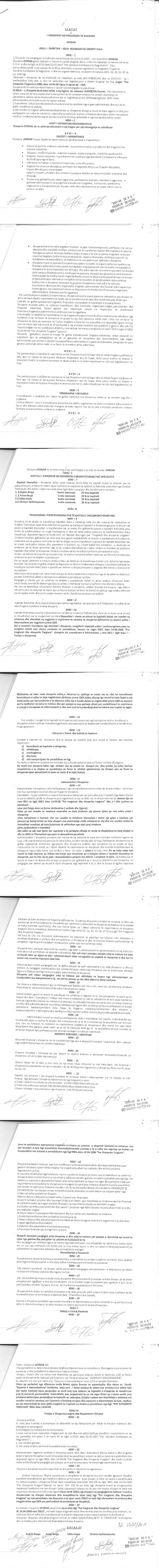 → Ekstrakti Historik i Regjistrit Tregtar date 29.08.2024 → Statuti fillestar i shoqerise dhe dokumenta te ndryshme → Statuti i perditesuar i shoqerise → Vendim i Asamblese se Ortakeve date 30.06.2012 → Vendim i Asamblese se Ortakeve date 30.06.2012 → Vendim i Asamblese se Ortakeve date 20.07.2014 → Vendim i Asamblese se Ortakeve date 20.07.2019 → Vendim i Asamblese se Ortakeve date 28.05.2024 → Kontrate e shitjes se kuotave date 03.09.2014 |