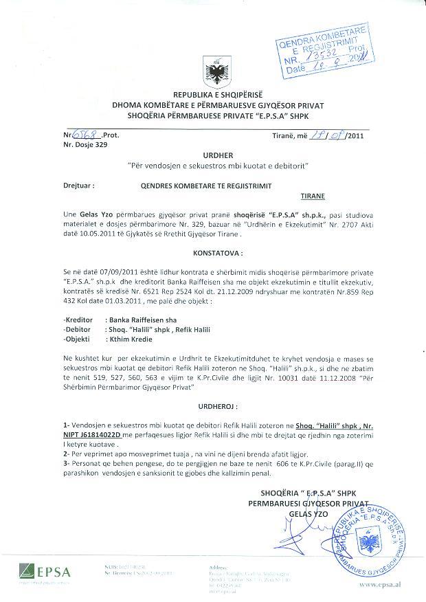 | Çështje Ligjore: | I. Më datë 19.09.2011, me anë të urdhrit Nr. 6568 Prot, lëshuar nga shoqëria përmbaruese private “E.P.S.A” sh.p.k, u vendos masa e sekuestros konservative mbi kuotat qe debitori Refik Halili zotëron në shoqërinë "HALILI" sh.p.k me NUIS (NIPT) - J61814022D dhe mbi të drejtat që rrjedhin nga zotërimi i këtyre kuotave. Objekti i sekuestros është kthimi i kredisë ndaj Bankës Raiffeisen sh.a. II. Më datë 20.08.2012, me anë të urdhrit Nr. 11351 Prot., lëshuar nga shoqëria përmbaruese private "E.P.S.A" sh.p.k, u vendos sekuestro mbi kuotat e debitorit "Halili" sh.p.k me NUIS (NIPT) - J61814022D me përfaqesues z. Refik Halili, si dhe mbi të drejtat që rrjedhin nga zotërimi i këtyre kuotave duke ndaluar tjetërsimin ose disponimin e tyre si dhe ushtrimin e të drejtave që rrjedhin nga këto kuota. Objekti i sekuestros është pagimi i gjobës ndaj Inspektoriatit Ndërtimor Urbanistik Kombëtar. III. Më datë 03.10.2012, me anë të urdhrit Nr. 13115 Prot, lëshuar nga shoqëria përmbaruese private "E.P.S.A" sh.p.k, u hoq sekuestros mbi kuotat që debitori Refik Halili zotëron në shoqërinë "Halili" sh.p.k me NUIS (NIPT) - J61814022D, e kërkuar me shkresën Nr. 6568 Prot. datë 19.09.2011. IV. Më datë 18.02.2013, me anë të Urdhrit Nr. 086-13 Regj., Nr. 04040 Prot., lëshuar nga Shoqëria "Shërbimi Përmbarimor ZIG" sh.p.k., u urdhërua vendosja e masës së sekuestros konservative në aktivet e palës debitore “Halili” sh.p.k me Nipt J61814022D. Aktivet e mësipërme do të qëndrojnë të sekuestruara deri në një urdhëresë të dytë. Objekti i sekuestros është kthimi i shumës së detyruar ndaj shoqërisë “Al - Tek” shpk. V. Më datë 27.03.2013, me anë të shkresës Nr. 07652 Prot, lëshuar nga shoqëria "Shërbimi Përmbarimor ZIG" sh.p.k, u hoq sekuestro konservative në aktivet e palës debitore, shoqërisë "Halili" sh.p.k me NUIS (NIPT) - J61814022D, si dhe në kuotat që kjo shoqeri zotëron në shoqëri të tjera të regjistruara, sekuestro konservative është vendosur në zbatim të shkresës Nr. 04040 Prot. datë 18.02.2013, urdhër "Për vënien e sekuestros konservative" të leshuar nga Përmbaruesi Gjyqësor. VI. Më datë 07.08.2013, me anë të Urdhrit Nr. 20270Prot, Nr. 086-13 Regj, "Për Vendosjen e Sekuestros Konservative”, lëshuar nga “Shoqëria Shërbimi Përmbarimor ZIG”, drejtuar QKR, u urdhërua vendosja e masës së sekuestros konservative në aktivet e palës debitore shoqëria “Halili” shpk, si dhe në kuotat që kjo shoqëri zotëron në shoqëritë e tjera të regjistruara pranë jush. Aktivet e mësipërme do të qëndrojne të sekuestruara deri në një urdheresë të dytë. VII. Më datë 18.10.2013, me anë të urdhrit Nr. 1931 Prot. 524 Regj, lëshuar nga zyra përmbarimore "Ardael" sh.p.k, u vendos masa e sekuestros konservative mbi kapitalin e shoqërisë "Halili" sh.p.k, për shkak se shoqëria "Halili" sh.p.k është debitor ndaj Banka Kombëtare Tregtare sha. Dokumentacioni do të qëndrojë i bllokuar deri në një urdhër të dytë. VIII. Më datë 23.10.2013, me anë të Kërkesës Nr.086-13 Regj. Nr. 26741 Prot, lëshuar nga "Shërbimi Përmbarimor ZIG" sh.p.k, u urdhërua heqja e masës së sekuestros Konservative nga aktivet e palës debitore “HALILI” sh.p.k pajisur me NUIS(NIPT) - J61814022D, si dhe në kuotat që kjo shoqëri zotëron në shoqëritë e tjera, të vendosur me shkresën Nr.20270 Prot, Nr.086- 13 Regj, datë 07.08.2013. IX. Më datë 31.10.2013, me anë të Urdhrit nr. 1931/1 Prot, nr. 524 Regj “Për heqjen e sekuestros konservative", lëshuar nga zyra përmbarimore "Ardael", u urdhërua heqja e masës së sekuestros konervative mbi kapitalin e shoqërisë "HALILI" shpk me NIPT J61814022D, vendosur me urdhrin nr. 1931 prot, datë 18.10.2013 të shoqerise Përmabrimore Ardael deri në një urdhër të dytë. X. Më datë 13.06.2014, me anë të Urdhrit Nr. 1096 Prot., Nr. 524 Regj "Për Vënien e Sekuestros Konservative”, lëshuar nga Zyra Përmbarimore “ Ardael” sh.p.k, u urdhërua vendosja e masës së sekuestros konservative mbi kapitalin e shoqërisë “Halili” sh.p.k me NIPT J61814022D, me përfaqësues ligjor Refik Halili, për shkak se shoqëria “Halili” sh.p.k është debitor ndaj Banka Kombëtare Tregtare sh.a. Dokumentacioni do të qëndrojë i bllokuar deri në një urdhër të dytë. XI. Më datë 25.06.2014, me anë të Urdhrit Nr.1176 Prot., Nr.524 Regj "Për Heqjen e Sekuestros Konservative", e lëshuar nga Zyra Përmbarimore Ardeal sh.p.k, u urdhërua heqja e sekuestros konservative mbi kapitalin e shoqërisë “Halili”, vendosur me urdhërin Nr. 1096 Prot., datë 13.06.2014 deri në një urdhër të dytë. XII. Më datë 22.10.2014, me anë të Urdhrit Nr. 10538 Prot., Nr. Dosje 329 "Për heqjen e sekuestros mbi kuotat e debitorit”, lëshuar nga Shoqëria Përmbaruese Private "E.P.S.A" sh.p.k., u urdhërua heqja e sekuestros mbi kuotat e debitorit shoqëria “Halili” sh.p.k., të vendosur me Nr. 11351 Prot., datë 20.08.2012. XIII. Më datë 10.11.2014, me anë të shkresës nr. 81909/41 Prot, të Drejtorisë Rajonale Tatimore Tiranë, u vendos të mos lejohen të kryhen tjetërsime mbi titujt e pronësisë, përfshirë dhe shitblerje aksionesh deri në shlyerjen e detyrimeve tatimore, për tatimpaguesin “HALILI” me NIPT J61814022D. XIV. Më datë 30.04.2015, me anë të shkresës Nr. 30581/1 Prot, lëshuar nga Drejtoria Rajonale Tatimore Tiranë, u kërkua vendosja e Barrës së Sigurisë mbi titujt e pronësisë, ndaj tatimpaguesit debitor, "Halili", me NUIS (NIPT) - J61814022D. XV. Më datë 27.05.2015, me anë të Urdhrit Nr. 524 Regj., lëshuar nga Zyra Përmbarimore "Ardael" sh.p.k., u urdhërua vendosja e masës së sekuestros konservative mbi kapitalin e shoqërisë "Halili" sh.p.k, për shkak se është debitor ndaj Banka Kombëtare Tregtare sh.a. Dokumentacioni do të qëndrojë i bllo
