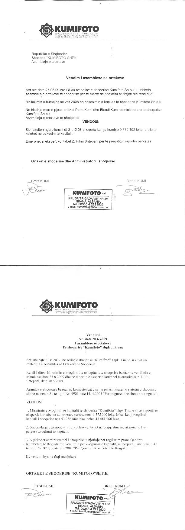→ Ektrakti Historik i Regjistrit Tregtar date 12.06.2023 → Akt themelimi dhe Statuti i Shoqerise → Vendim i Asamblese se Ortakeve, Zmadhim Kapitali date 26.07.2005 → Vendim i Asamblese se Ortakeve, Zvogelim Kapitali date 30.06.2009 → Vendim i Asamblese se Ortakeve, Zvogelim Kapitali date 15.11.2010 → Kontrate Shitblerje Kuotash date 08.12.2010 |
