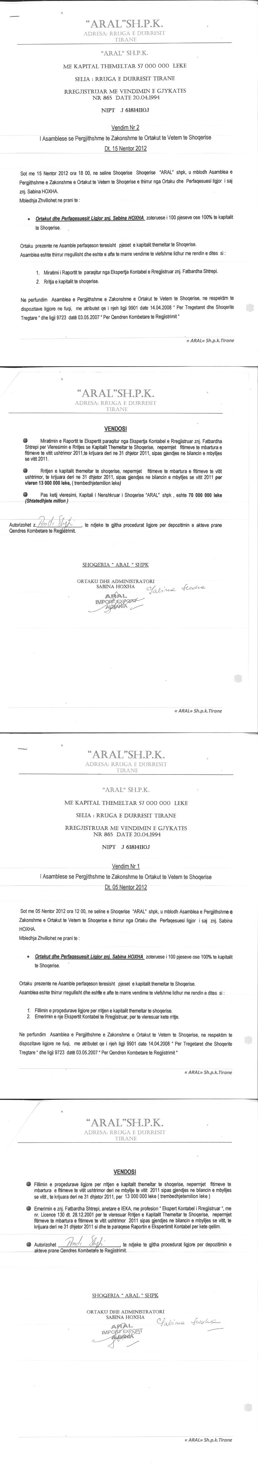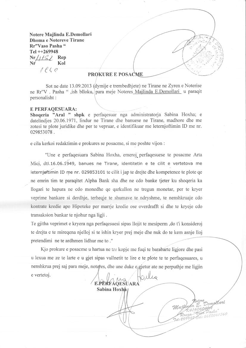 | Çështje Ligjore: | Me date 28/10/2016, me ane te Prokures se Posacme, nr.1182 rep., nr. 1940 kol.,date 13.09.2013 leshuar nga Sabina Hoxha, administratore e shoqerise Aral sh.p.k e cili emeron si perfaqesues te posacem Arta Mici, me tagra perfaqesimi sipas kesaj procure. |