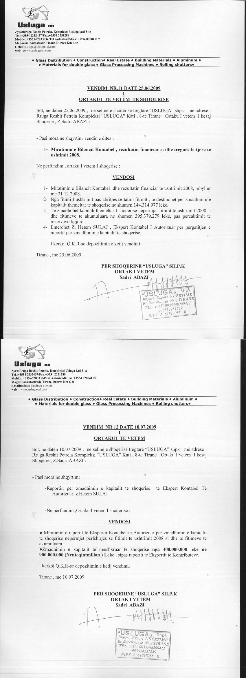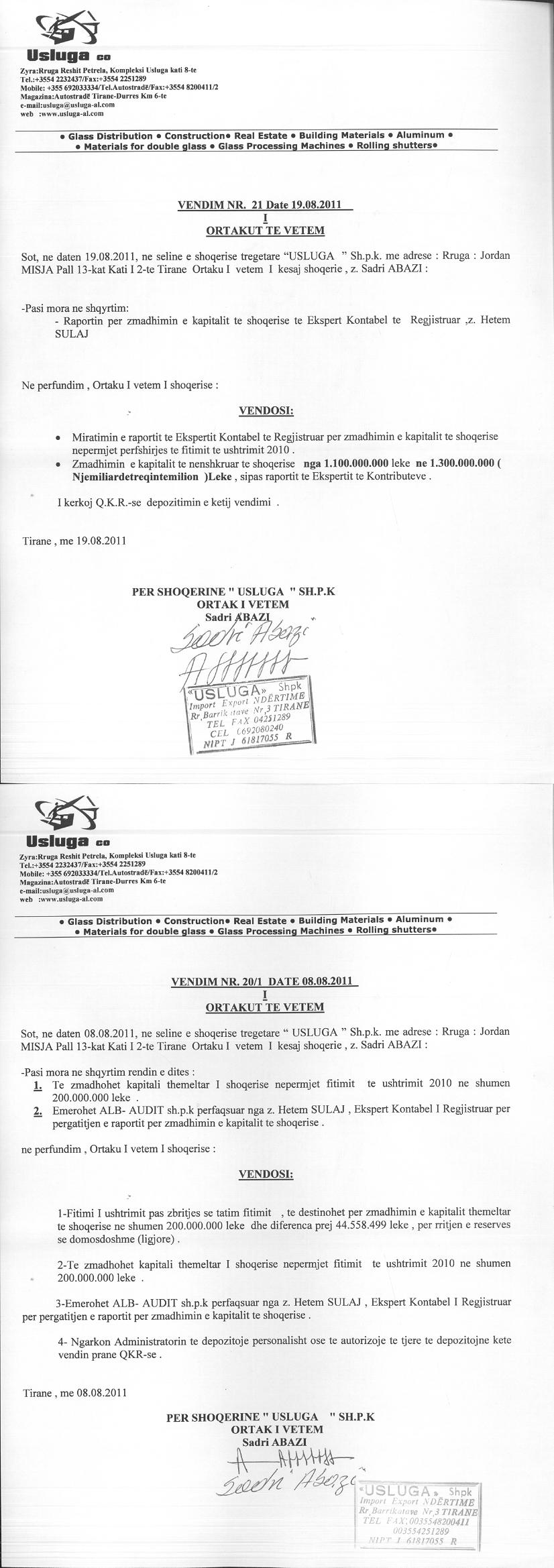 | Çështje Ligjore: | Bashkimi me Përthithje I. Me datë 02.01.2012, u nënshkrua Akt-Marrëveshja, Projekt Bashkimi, për bashkimin me përthithje të shoqërisë "Jeni-Co" shpk (shoqëria e përthithur) nga shoqëria "Usluga" shpk (shoqëria përthithëse). II. Me datë 01.02.2012, u miratua raporti i ekspertit për bashkimin me përthithje të shoqërive tregtare "Jeni-Co" shpk (shoqëria e përthithur) dhe "Usluga" shpk (shoqëria përthithëse). Pas bashkimit emri i shoqërisë mbetet i njëjtë me emrin e shoqërisë përthithëse "Usluga" shpk Shoqëria e përthithur "Jeni-Co" shpk transferon të gjithë totalin e aktivit dhe pasivit në favor të shoqërisë përthithëse Kapitali i shoqërisë së rë bëhet 1.300.100.000 (një miliardë e treqind milion e njëqind mijë) lekë. Shoqëria e përthithur pushon së ekzistuari dhe do të çregjistrohet nga QKB. |