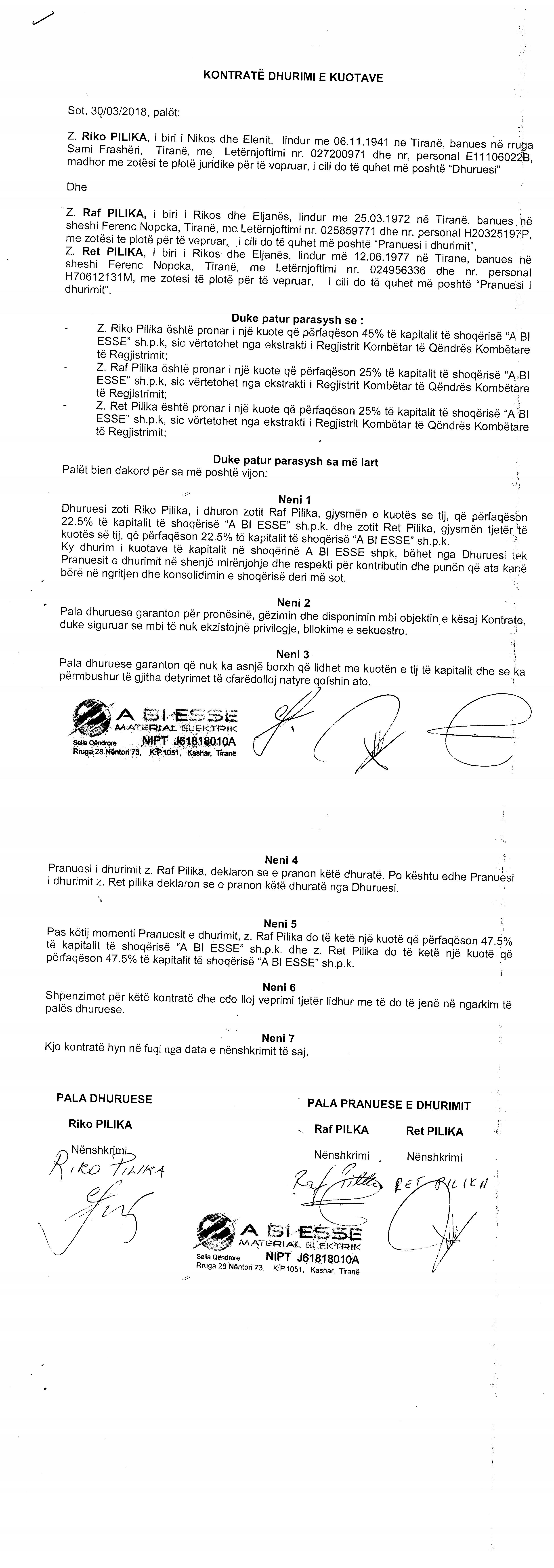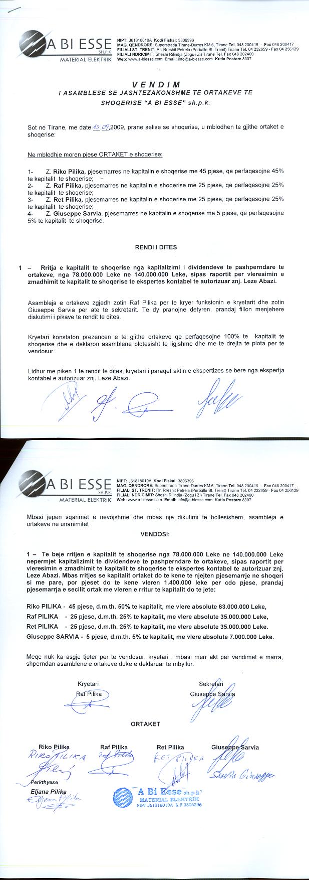 → Ekstrakt historik i regjistrit tregtar date 26.07.2021 → Statuti i shoqerise → Raporti per vleresimin e zmadhimit te kapitalit date 13.08.2010 → Kontrate shitje date 01.06.2001 → Kontrate shit-blerje date 25.10.2003 → Kontrate shitjeje date 01.06.2001 → Kontrate shit-blerje date 11.12.1999 → Kontrate shit-blerje ndermjet Giuseppe Sarvias dhe ortakeve Paolo Mellano dhe Raf Pilika → Kontrate shit-blerje ndermjet shitesit Luiggi Trigari dhe bleresve Aldo Boetti dhe Raf Pilika date → Kontrate shit-blerje ndermjet shitesit Roberto Dako dhe bleresve Giuseppe Sarvia, Luigi Trigari → Kontrate shit-blerje date 25.10.2003 → Kontrate dhurimi e kuotave date 30.03.2018 → Kontrate shit-blerje date 26.12.2008 → Kontrate shit-blerje date 29.07.2008 → Vendim i asamblese se ortakeve date 02.11.2020 → Vendim i asamblese se ortakeve per rritjen e kapitalit date 13.09.2009 → Vendim i asamblese se ortakeve per rritjen e kapitalit date 10.12.2011 → Vendim i asamblese se ortakeve per rritjen e kapitalit date 25.09.2008 → Vendim i asamblese se ortakeve per rritjen e kapitalit date 13.07.2016 → Ekstrakt Historik i Regjistrit Tregtar date 09.06.2023 |