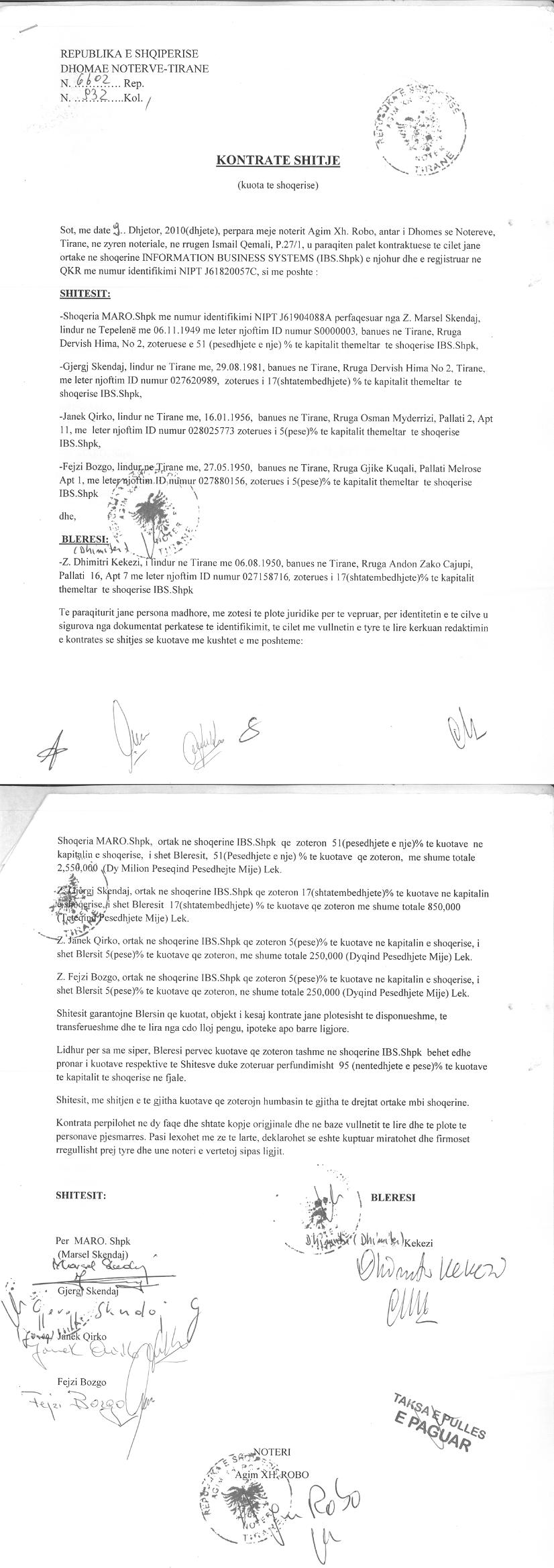 IV.Sipas Kontrates se shitjeve te kuotave date 09.12.2010, eshte realizuar shitja e 78% te kuotave nga ortaket Janaq Qirko(5%), Fejzi Bozgo(5%), Gjergj Skëndaj(17%) dhe "MARO"shpk (51%) ne favor te Dhimiter Kekezi.Pas shitjes se kuotave Janaq Qirko, Fejzi Bozgo, Gjergj Skëndaj dhe "MARO"shpk largohen nga shoqëria, ndërsa ortake te shoqërisë mbeten Dhimiter Kekezi dhe Laura Gjebrea duke zotëruar përkatësisht 95% dhe 5% te kuotave te kapitalit.