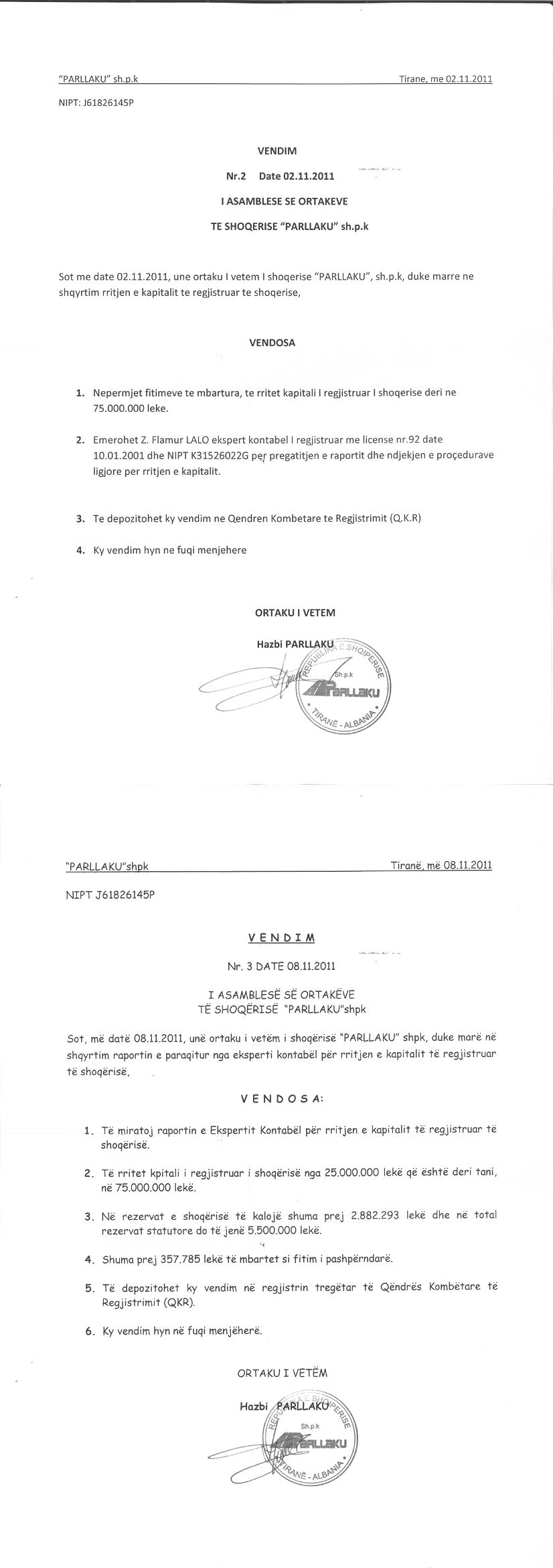 → Ektrakti Historik i Regjistrit Tregtar date 12.06.2023 → Statuti i Shoqerise → Vendim i Ortakut te Vetem, Zmadhim Kapitali date 25.06.2005 → Vendim i Ortakut te Vetem, Zmadhim Kapitali date 08.11.2011 → Marreveshje Siguruese dhe Pengu mbi Kuotat date 13.05.2013 → Kontrate Pengu mbi Kuotat dhe Marrëveshje e Kolaterali Financiar date 14.04.2014 → Marreveshje Siguruese mbi kuotat e Pjesemarrjes ne Shoqeri, Kontarte Kredie me Kufi dhe Kontarte Kredie Bankare date 25.07.2017 → Marreveshje Siguruese mbi Kuotat e Pjesemarrjes ne Shoqeri date 22.06.2018 → Vendim i Ortakut te Vetem, Kalim Pasurie date 07.02.2019 → Marreveshje Siguruese mbi Kuotat e Pjesemarrjes ne Shoqeri date 16.12.2020 → Urdher per Venie Sekuestro date 02.11.2021 |