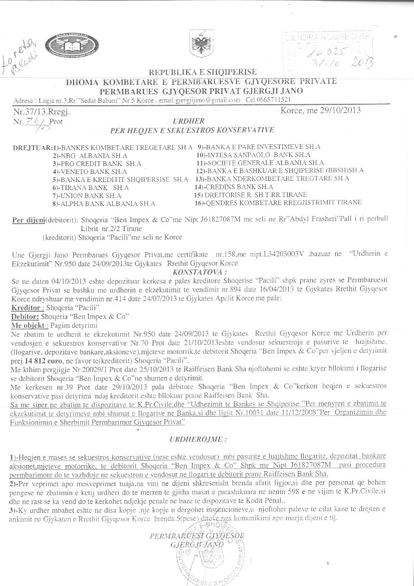 | Çështje Ligjore: | I. Me date 24/10/2013, me ane te Urdherit Nr.70 Prot., Nr. 37/13 Regj, datë 21.10.2013, lëshuar nga Permbaruesi Gjyqesor Privat Gjergji jano , u urdherua vendosja e mases se sekuestros konservative mbi aksionet e pales debitore Shoqeria “BEN IMPEX & CO” sh.p.k me NIPT J61827087M, per vjeljen e detyrimit, per ekzekutimin e titullit ekzekutiv ne favor te (kreditorit) Shoqeria ” Pacili “ sh.p.k. II. Me date 04/11/2013, me ane te Urdhërit Nr.37/13. Regj, Nr.74/15 Prot date 29.10.2013, lëshuar nga përmbaruesi gjyqësor privat Gjergji Jano, u urdherua heqja e masës së sekuestros konservative mbi pasuritë e luajtshme, llogaritë, depozitat bankare, aksionet, mjetet motorike te debitorit “ Ben Impex & Co”% me Nipt J 61827087 M, pasi proçedura do të vazhdojë në sekuestron e vendosur në llogari të debitorit pranë Raiffeisen Bank Sh.A. III. Me date 28/03/2014, me ane te Urdhrit Nr.768 Prot, Nr.1399 Regj, datë , 05.03.2014, lëshuar nga Shoqëria Përmbarimore “Bailiff Services Albania" sh.p.k, u urdherua: 1-Vendosja e masës së sekuestros në 100 % të kuotave që zotërohen nga pala debitore Arben Naun Petto në shoqërinë “BEN IMPEX & CO” sh.p.k, me NIPT J61827087M. 2- Dorëzimin e kuotave të shoqërisë “Instituti i Studimeve dhe Projektimeve Pyjore” sh.a, në masën 100% të tyre të zotëruara nga Arben Naun Petto, dhe kuotave të shoqërisë “BEN IMPEX & CO” sh.p.k, në masën 100% të tyre të zotëruara nga Arben Naun Petto, tek barrëmarrësi “Raiffeisen Bank” sh.a, në zbatim të Marrëveshjes Siguruese Nr.2341 Rep, Nr.1018 Kol, datë 14.05.2011, dhe Marrëveshjes Siguruese Nr.4070 Rep, 1813 Kol, datë 24.08.2012, dhe Udhrit të Ekzekutimit Nr.1038 Akti, Datë 18.02.2013, të Gjykatës së Rrethit Gjyqësor Tiranë, dhe Nenit 31 të Ligjit nr.8537 datë 18.10.1999 “Për Barrët Siguruese”. IV. Me date 10/11/2014, me ane te Urdhrit nr.3619 prot. 1399 regj. dt.03.11.2014, lëshuar nga Shoqëria Përmbarimore "Bailiff Services Albania, BSA", u urdherua heqja e masës së sekuestros konservative në kuotat/aksionet e z.Arben Naun Petto në masën 100% që zotëron të Shoqëria "Ben Impex&Co" me NUIS (NIPT)-J61827087M, të vënë me shkresë nr.768 prot. dt.05.03.2014. V. Me date 11/11/2014, me ane te Urdhrit Nr.3646 Prot., Nr. 1399 Regj., datë 05.11.2014, "Për Vënien e Sekuestros Konservative”, lëshuar nga Shoqëria Përmbarimore “Bailiff Services Albania” sh.p.k., drejtuar QKR, u urdherua: 1-Vendosja e masës së sekuestros në 100% të kuotave që zotërohen nga pala debitore, Miranda Kapllani, në shoqërinë “Ben Impex & Co” sh.p.k., me NUIS (NIPT) J61827087M. 2-Dorëzimin e kuotave të shoqërisë “Ben Impex & Co” sh.p.k., në masën 100% të tyre të zotëruara nga Miranda Qani Kapllani tek barrëmarrësi “Raiffeisen Bank” sh.a, në zbatim të Marrëveshjes Siguruese Nr.5068 Rep., Nr.2331 Kol., date 04.12.2012 dhe Urdhërit të Ekzekutimit Nr.1038 Akti, date 18.02.2013, të Gjykatës së Rrethit Gjyqësor Tiranë, dhe nenit 31 të ligjit Nr.8537, dat 18.10.1999 “Për Barrët Siguruese”. 3- Vendosjae masës së sekuestros konservative në të tjera kuota të cilat zotërohen nga pala debitore Shoqëria “Ben Impex & Co” sh.p.k., me NUIS (NIPT) J61827087M”. VI. Me date 18/01/2022, me ane te Deklarates Noteriale Nr.129 Rep., date 14.01.2022, leshuar nga "Raiffeisen Bank” sha, ku shprehet se heqe dore nga pengu ne kuotat e shoqerise "Ben Impex & Co” sh.p.k. |