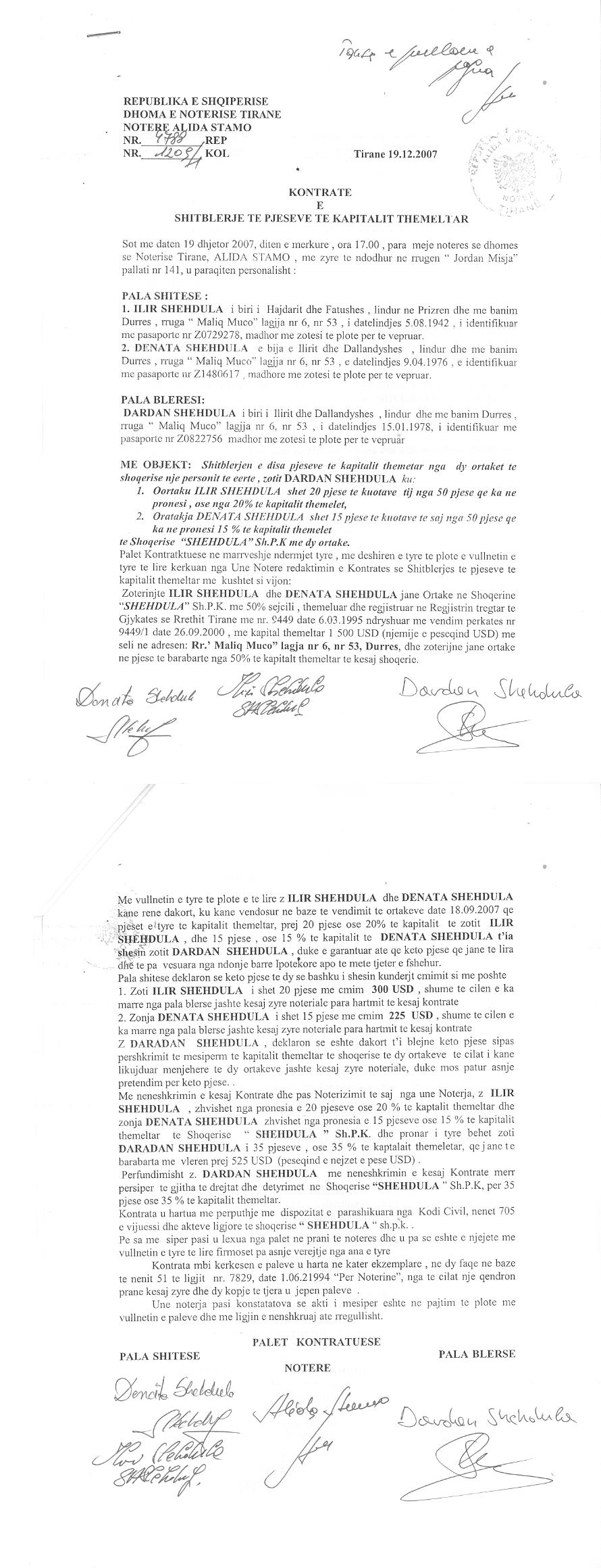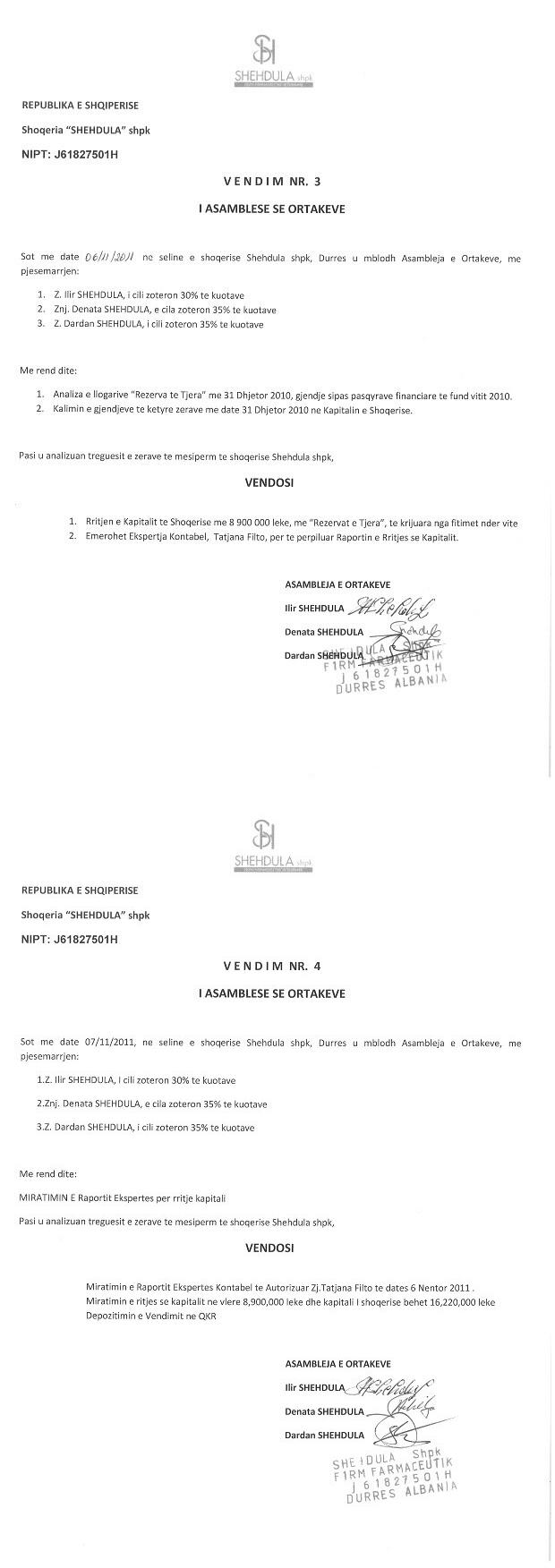 → Ekstrakt historik i regjistrit tregtar date 26.07.2021 → Akti i themelimit → Kontrate shit-blerje date 20.09.2000 → Kontrate shitblerje e pjeseve te kapitalit date 19.12.2007 → Vendimi i asamblese se ortakeve per rritjen e kapitalit date 06.11.2011 → Vendimi i asamblese se ortakeve per zmadhimin e kapitalit date 29.06.2018 → Vendim i asamblese se ortakeve per zmadhimin e kapitalit date 30.06.2016 |
