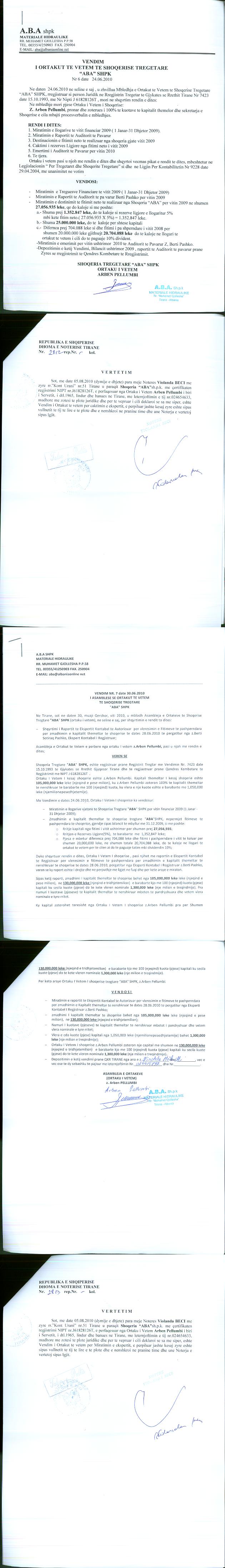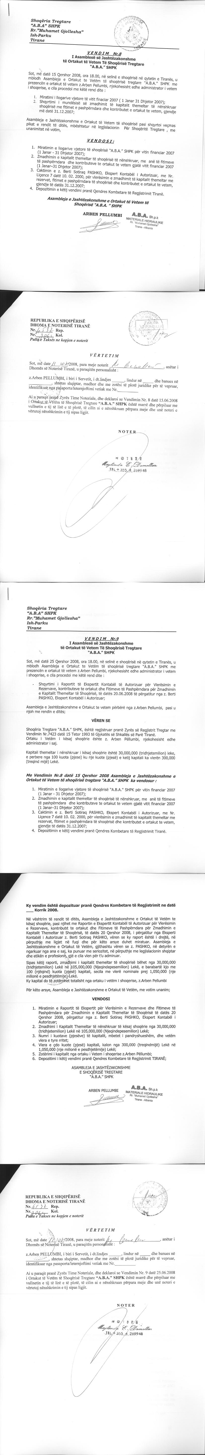 → Ekstrakt Historik i Regjistrit Tregtar date 13.08.2023 → Kontratë për Krijim e Shoqërisë → Statuti i Shoqërisë → Dokumenta të Ndryshëm → Kontratë Shitblerje Kuotash datë 17.05.2005 → Vendim i Asamblesë së Ortakëve, Zmadhim Kapitali datë 05.12.2003 → Vendim i Ortaku të Vetëm, Zmadhim Kapitali datë 15.06.2008 → Vendim i Ortakut të Vetëm, Zmadhim Kapitali datë 24.06.2010 → Vendim i Ortaku të Vetëm, Zmadhim Kapitali datë 29.06.2012 |