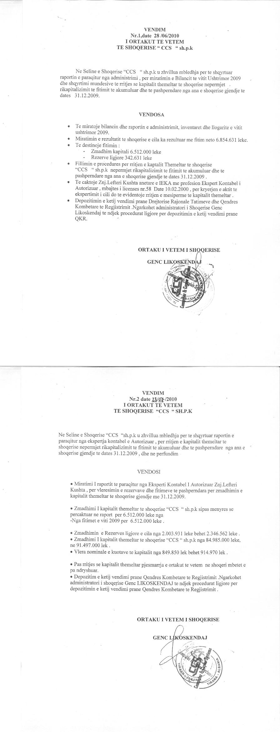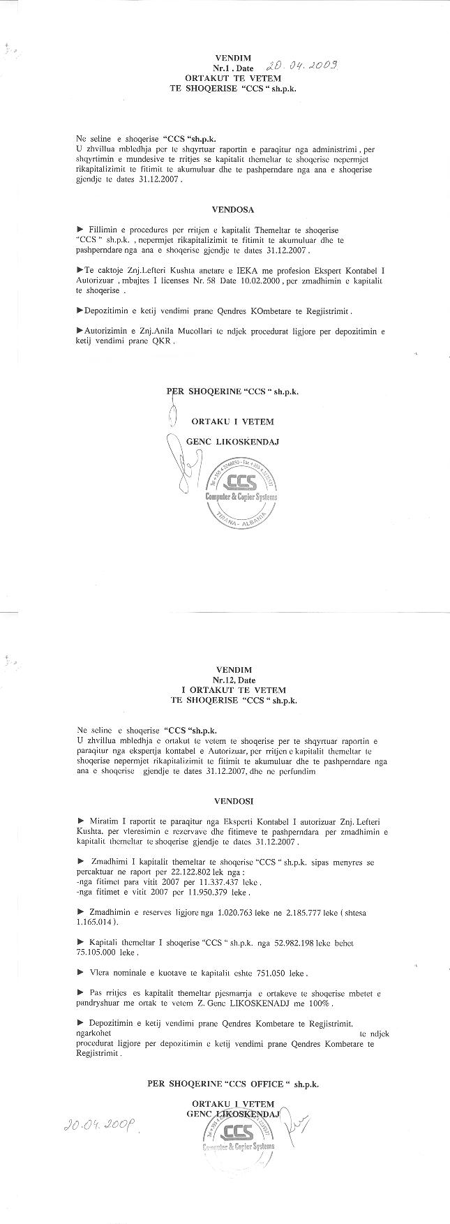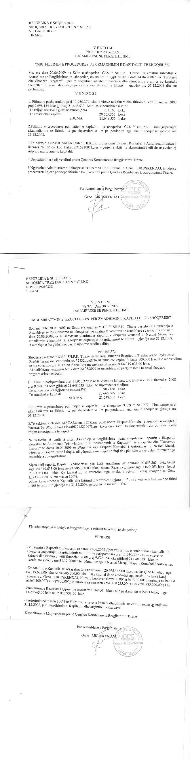 | Çështje Ligjore: | I. Me date 18.07.2017, me ane te Urdherit Nr.684 Prot, lëshuar nga shoqeria permbarimore E.G BAILIFFS' SERVICES , protokolluar nga QKB me Nr.11061 Prot., datë 19.07.2017, u urdherua bllokimi i aksioneve te zoteruara nga pala debitore C.C.S. me NIPT-J61901033C. II. Me date 19.07.2017, me ane te Urdhrit Nr. 578/2 Prot, leshuar nga zyra permbarimore E.G Bailiff Service, per heqjen e mases se sekuestros konservative mbi te gjitha aksionet e zoteruara nga pala debitore, shoqeria "C.C.S (Computer & Copier System) Shpk me NUIS (NIPT) J61901033C, per ekzekutimin e Titullit Ekzekutiv, Vendim Gjyqesor Nr. 1395, date 25.05.2017 i Gjykates se Apelit Tirane. III. Me date 19.07.2017, me ane te Urdhërit Nr.578/2 Prot, protokolluar nga QKB me Nr. 11720 Prot., date 31.07.2017 "Për Heqen e Sekuestros Konservative”, lëshuar nga Shoqëria Përmbarimore"E.G BAILIFF SERVICE", drejtuar QKB, u urdherua heqja e masës sekuestro konservative mbi te gjitha aksionet e zoteruara nga pala debitore Shoqeria "C.C.S (Computer & Copier System) shpk identifikuar me NIPT J61901033C me administrator Z. Genci Likoskendaj per ekzekutimin e Titullit Ekzekutiv, Vendim Gjyqesor Nr. 1395 date 25.05.2017 I Gjykates se Apelit Tirane. |